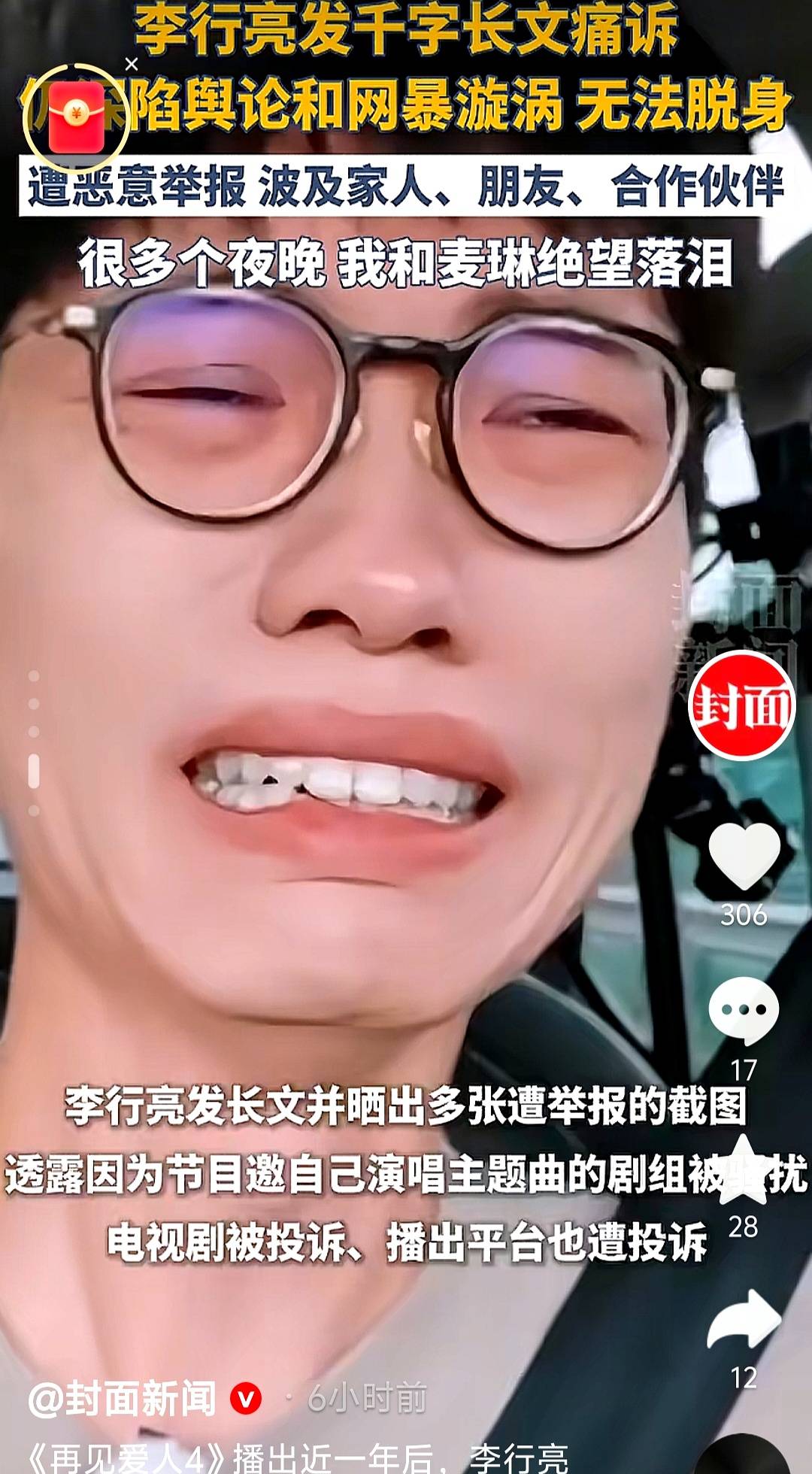 在《再见爱人4》中,李行亮与妻子麦琳的婚姻矛盾成为节目焦点。网友对其“过度迁就妻子”“纵容精神控制”的批评铺天盖地,甚至将私人情感上升至“道德审判”。节目收官后,李行亮的工作邀约被大规模取消,品牌合作临时撤单,演出场馆因举报停摆。他透露:“前天又撤了好几个单,现在除了直播,几乎接不到任何工作。”更令他难以接受的是,网友的指责从“婚姻观争议”演变为对其人格的全面否定:“阴暗心机男”“道德观扭曲”“对社会有不良影响”……这些标签让他的音乐事业和公众形象遭受重创。