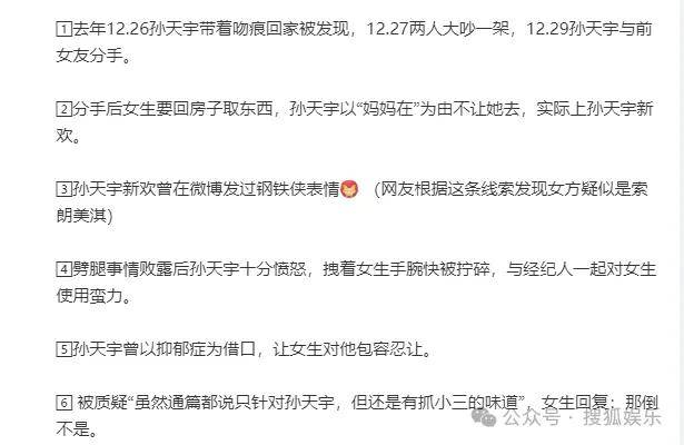 当时,孙天宇刚有些名气,突然冒出来一位他的前女友,女方发长文控诉孙天宇“劈腿出轨两头骗”,还表示在未分手的情况下,孙天宇就与同剧组女演员暧昧,被发现后孙天宇和经纪人一起对她动手,试图销毁证据。