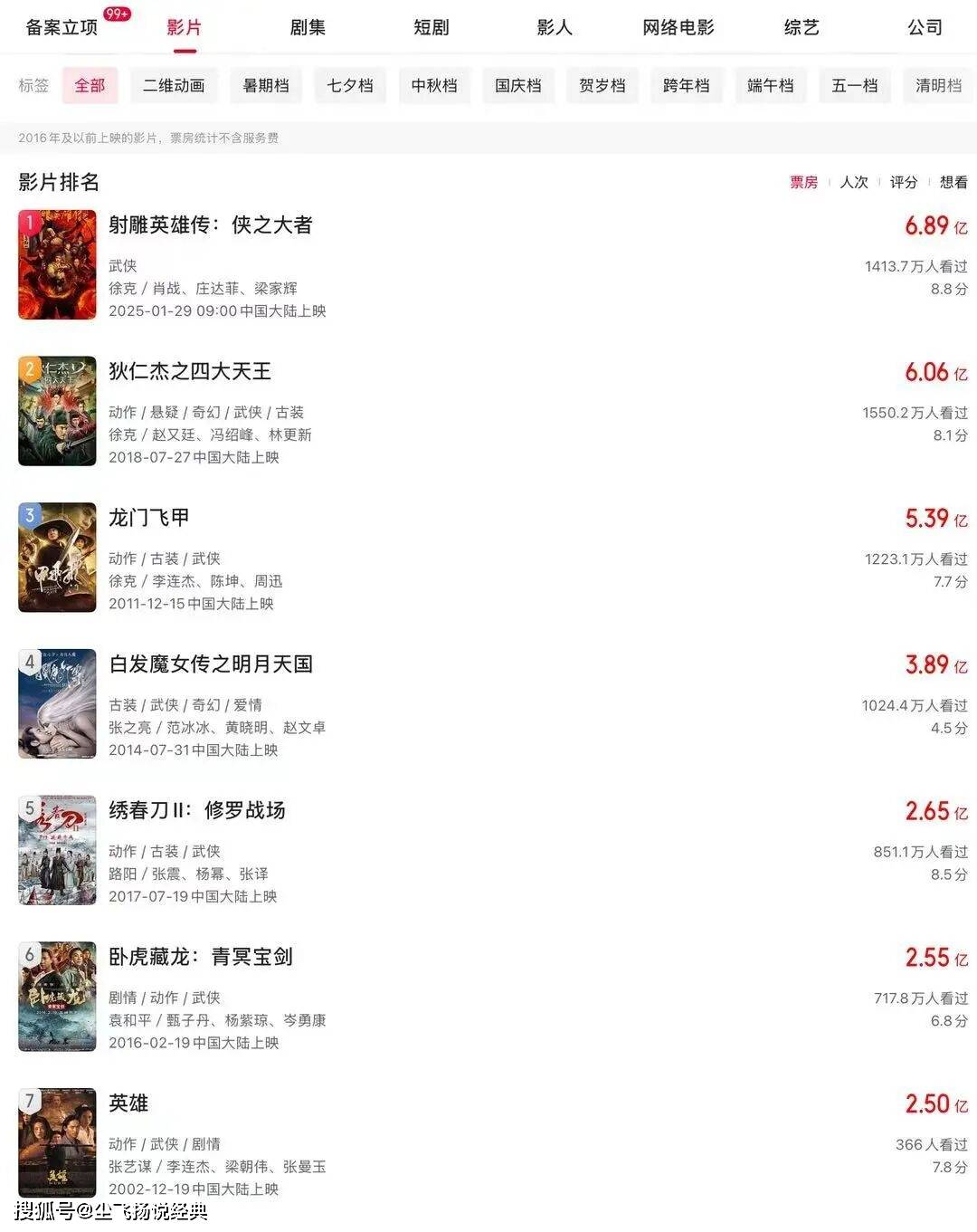 近十年来,能把武侠片做到六七亿的,只有徐克一人。武侠片的最好成绩,在票房总榜的排名是二百多名。