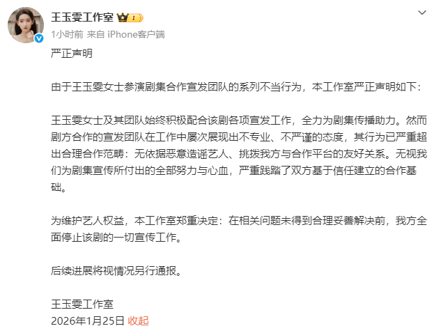 搜狐娱乐讯 25日,王玉雯工作室在社交平台上发布严正声明,宣布全面停止对王玉雯主演新剧的一切宣传工作!声明称:“剧方合作的宣发团队在工作中屡次展现出不专业、不严谨的态度,其行为已严重超出合理合作范畴:无依据恶意造谣艺人、挑拨我方与合作平台的友好关系。”