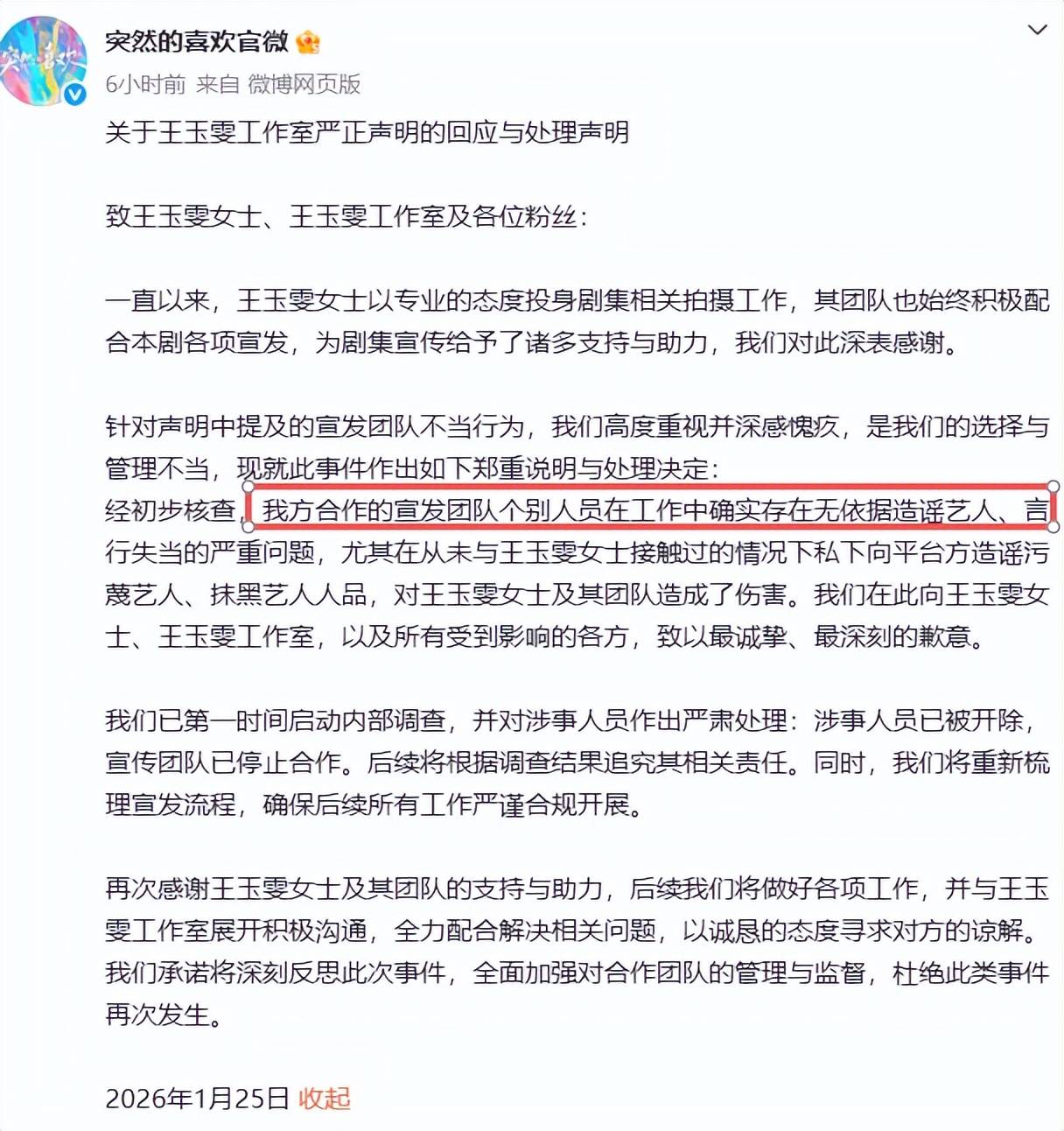 1月25日凌晨,王玉雯工作室全平台发布严正声明,宣布全面停止该剧一切宣传工作,矛头直指剧方合作宣发团队的恶意造谣与挑拨行为。