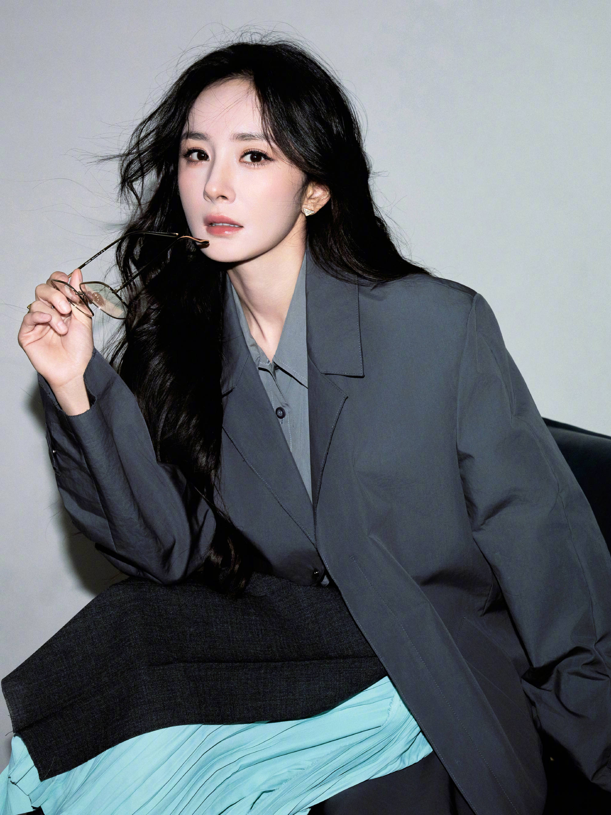 杨幂侧身而坐,灵动俏皮。