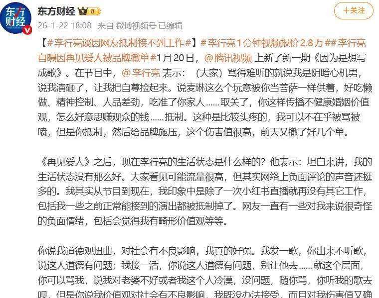 1月20日,歌手李行亮在腾讯视频的节目《因为是想写成歌》中,罕见地打开了心扉,分享了自己因参与情感观察类综艺《再见爱人4》而经历的职业危机。他毫不掩饰地表示,自己被网友贴上了传播畸形婚姻观的标签,结果导致多个品牌临时撤单,演出邀约也相继被抵制。他无奈地说:前天又撤了好几个单,这种节目播出后引发的口碑反噬,暴露了现实世界的残酷生存法则。