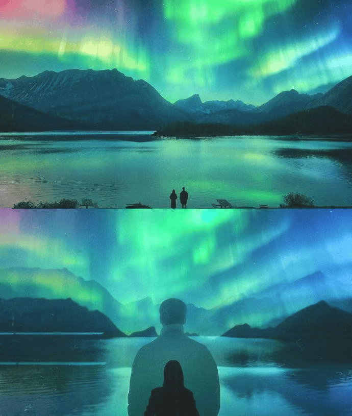 例如被称作全剧情感转折高光的加拿大极光名场面,男女主的身影在极光变幻的光影中交错重叠,两人借极光含蓄表达着内心克制又无法控制的动心,女主的那句“你以后只要看到极光,就会想到车茂熙了”和男主直接回应的“我其实早就看到极光了”,何尝不是对彼此真心的精准转译呢?