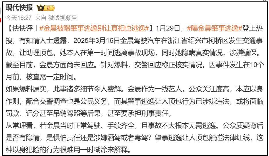 ——“从常理看,若金晨当时正常驾驶、手续齐全,且事故不大根本无需逃逸。公众质疑背后是否有隐情,是惧怕责任还是涉嫌酒驾或者毒驾?肇事逃逸让人顶包触碰法律红线,这种以身犯险的行为很难用一时糊涂来解释。”