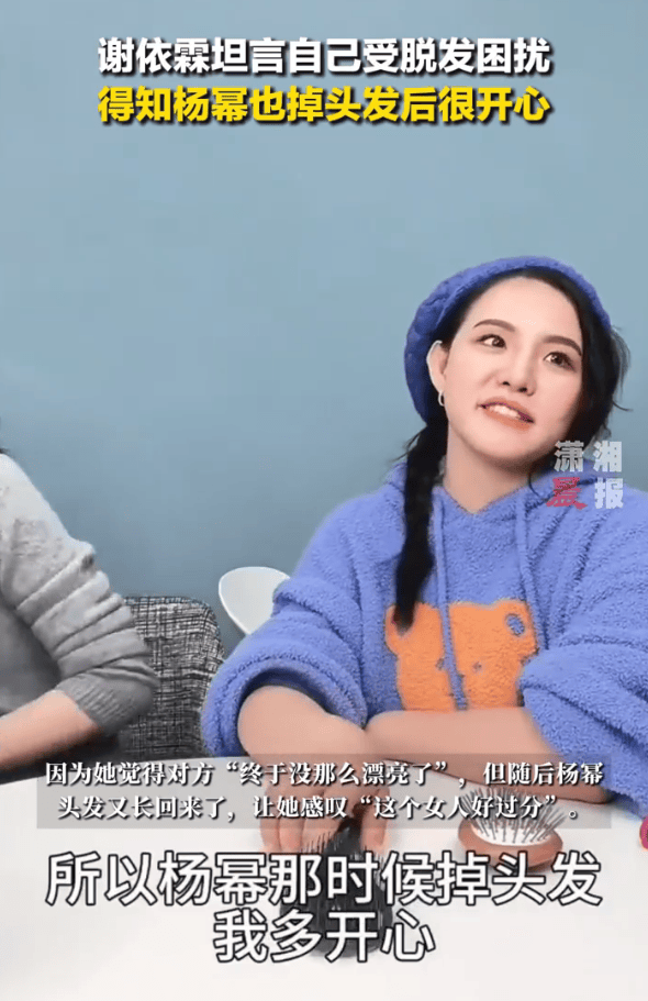 1月29日,在《papi的热烈欢迎》节目中,谢依霖坦言自己受脱发困扰,得知杨幂也曾掉头发时自己感到很开心。因为她觉得对方“终于没那么漂亮了”,但随后杨幂头发又长回来了,让她感叹“这个女人好过分”。