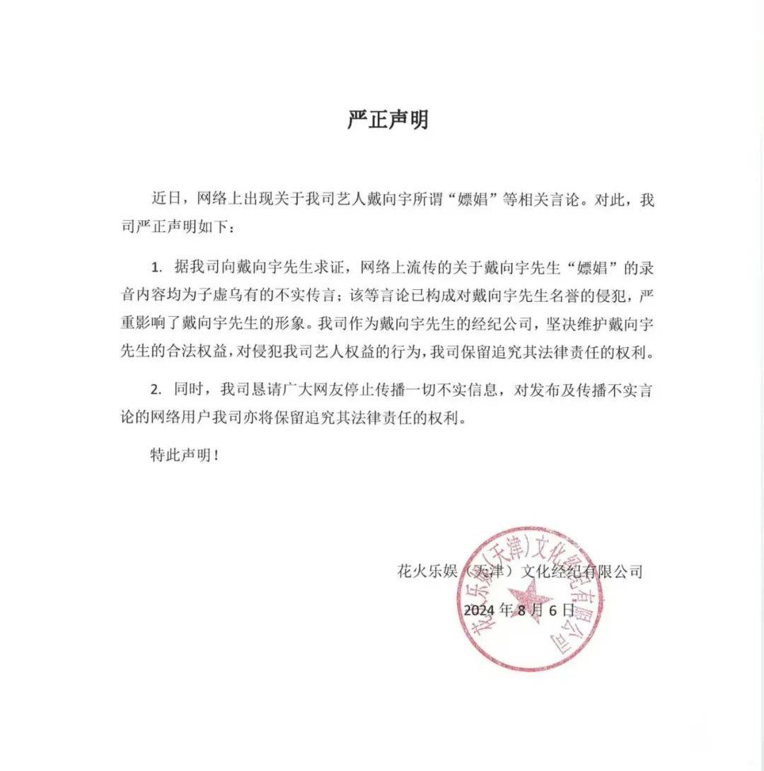 事情越闹越大,戴向宇工作室终于发声明回应,否认网传的嫖娼,表示网传的录音内容都是不实的。
