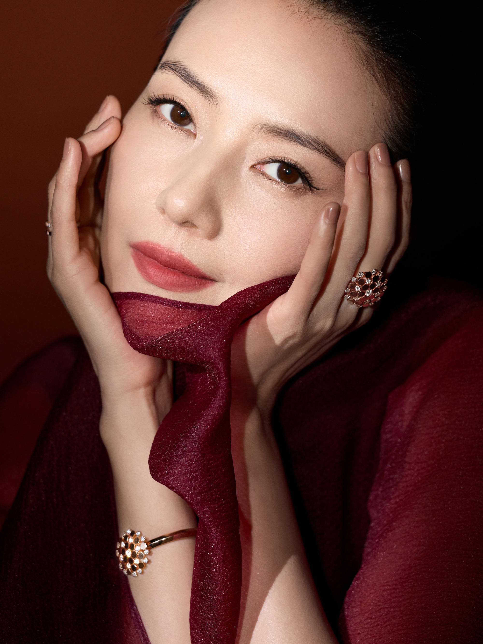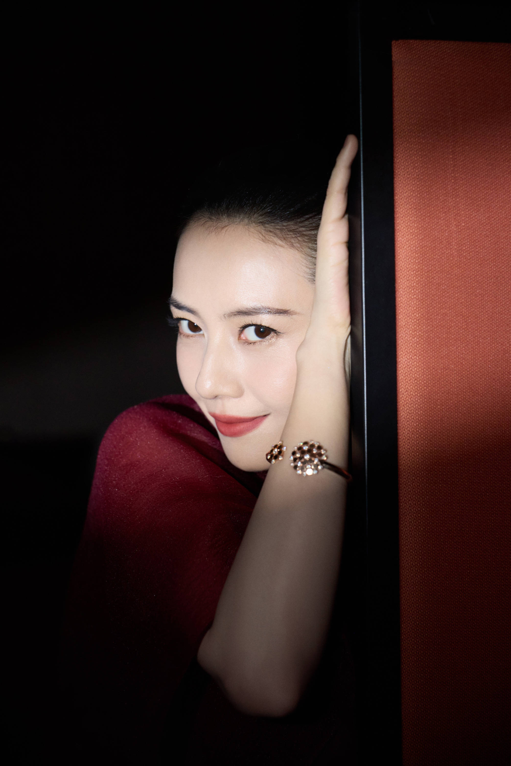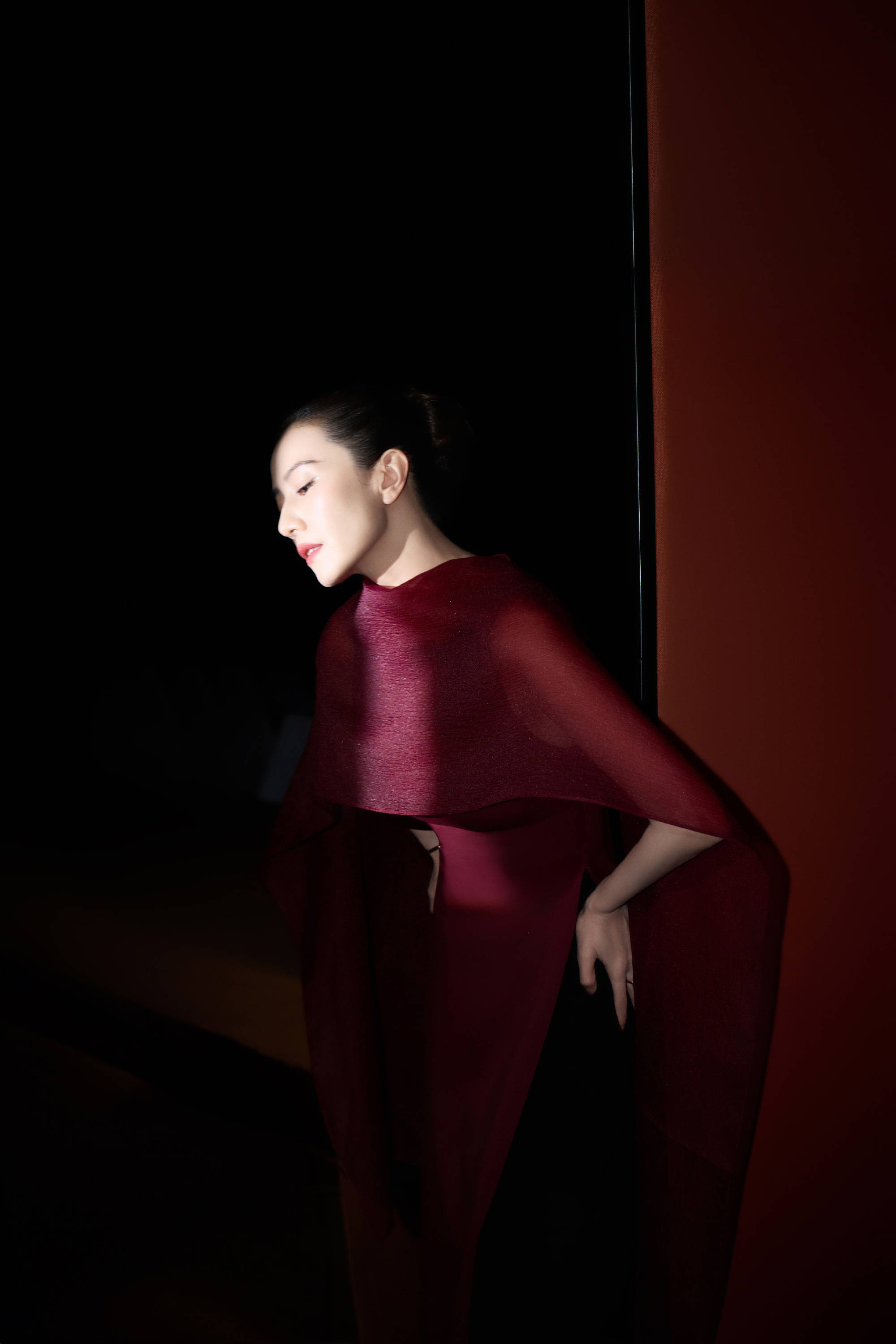 高圆圆用酒红色纱巾蒙面,氛围感拉满。