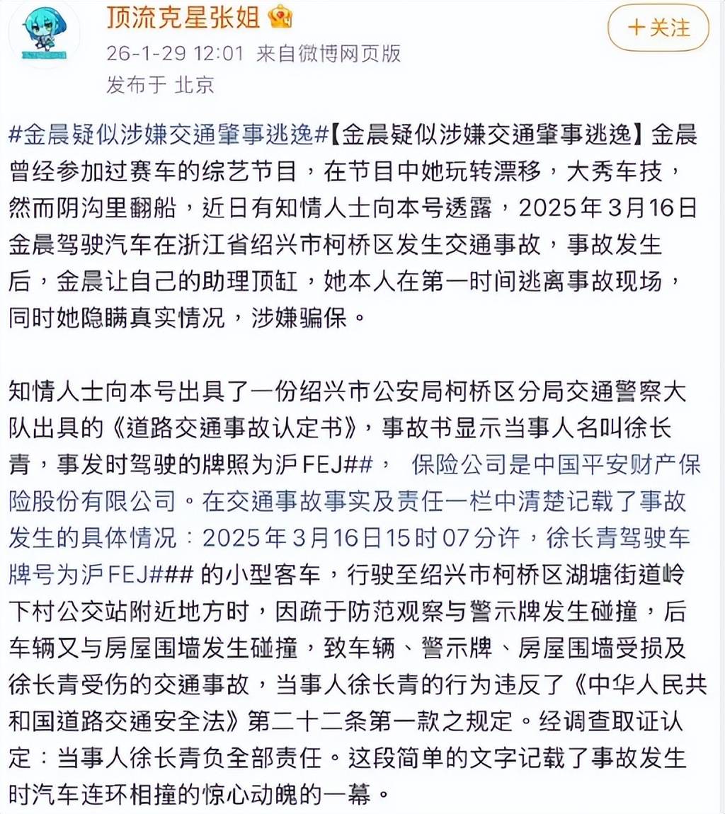 不到 48 小时,真相被扒得底朝天,金晨连遭 3 大噩耗,个个致命!第一个,就是肇事逃逸!