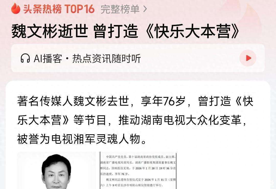 原湖南广电局长魏文彬去世了。或许他的名字没有何炅、谢娜那般家喻户晓,但正是他,这位低调而执着的男人,一手缔造了《快乐大本营》——这档定义了国民综艺的王牌节目,让无数周末的夜晚,多了一段守在电视机前的开怀时光。