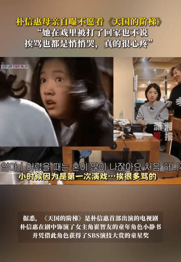 朴信惠母亲说:“我看到剧本有挨耳光的戏时,我以为是假装打,但是看到真的挨打后,从那个时候开始,到现在都没有看《天国的阶梯》。但是她这么挨打之后,回到家里也什么都不说,她不跟我们说,所以也不知道她在外面受了这么多苦,都是过了很久之后,经纪人跟我说明了这样的情况下发生了这样的事情,我真的很心疼。(女儿)小时候因为是第一次演戏,挨很多骂的,但是在人们面前是绝对不会哭的,都是去卫生间哭完,擦干眼泪再出来。”