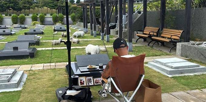 在墓地的入口处,他展示了大S最钟爱的泡菜和奶昔,一件接一件地摆放着,这种重复的动作中透露出一种令人毛骨悚然的熟练感。