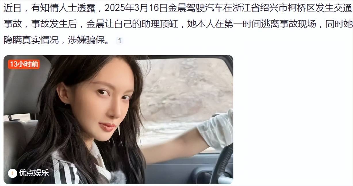 2025年3月16日金晨、经纪人及其助理徐长青同在一辆小型客车内,当天15时左右发生交通事故,报警后警方认定“驾驶人”徐长青全责,定责后走保险理赔。