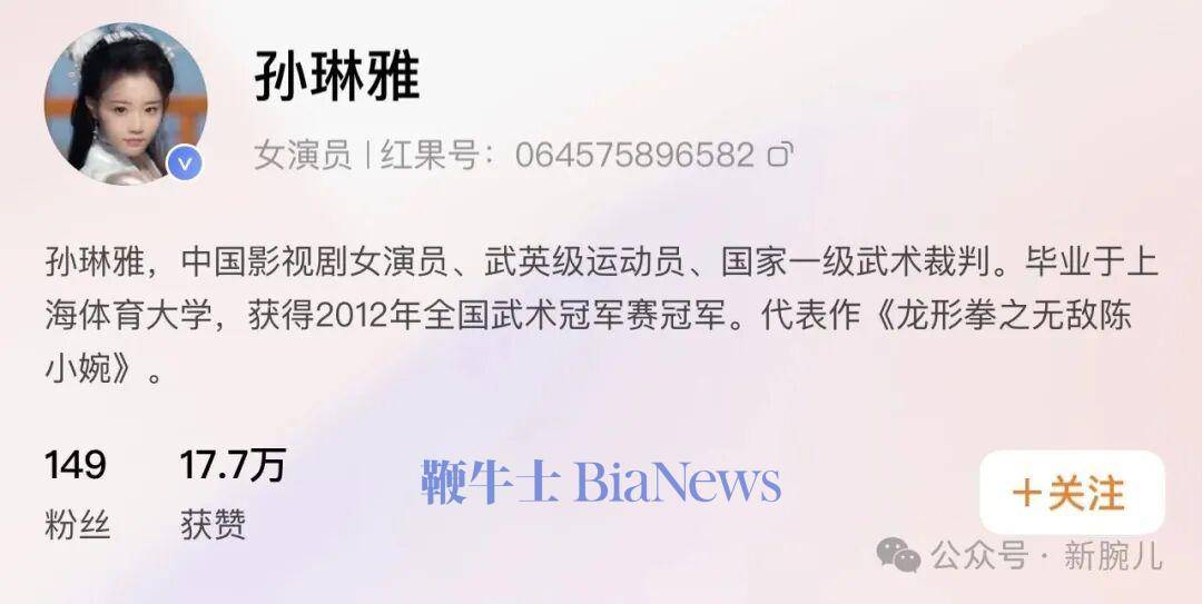 孙琳雅虽然作品不多,但是为武术专业出身。她毕业于上海体育大学,是武英运动员、国家一级武术裁判,曾获得2012年全国武术冠军赛冠军。