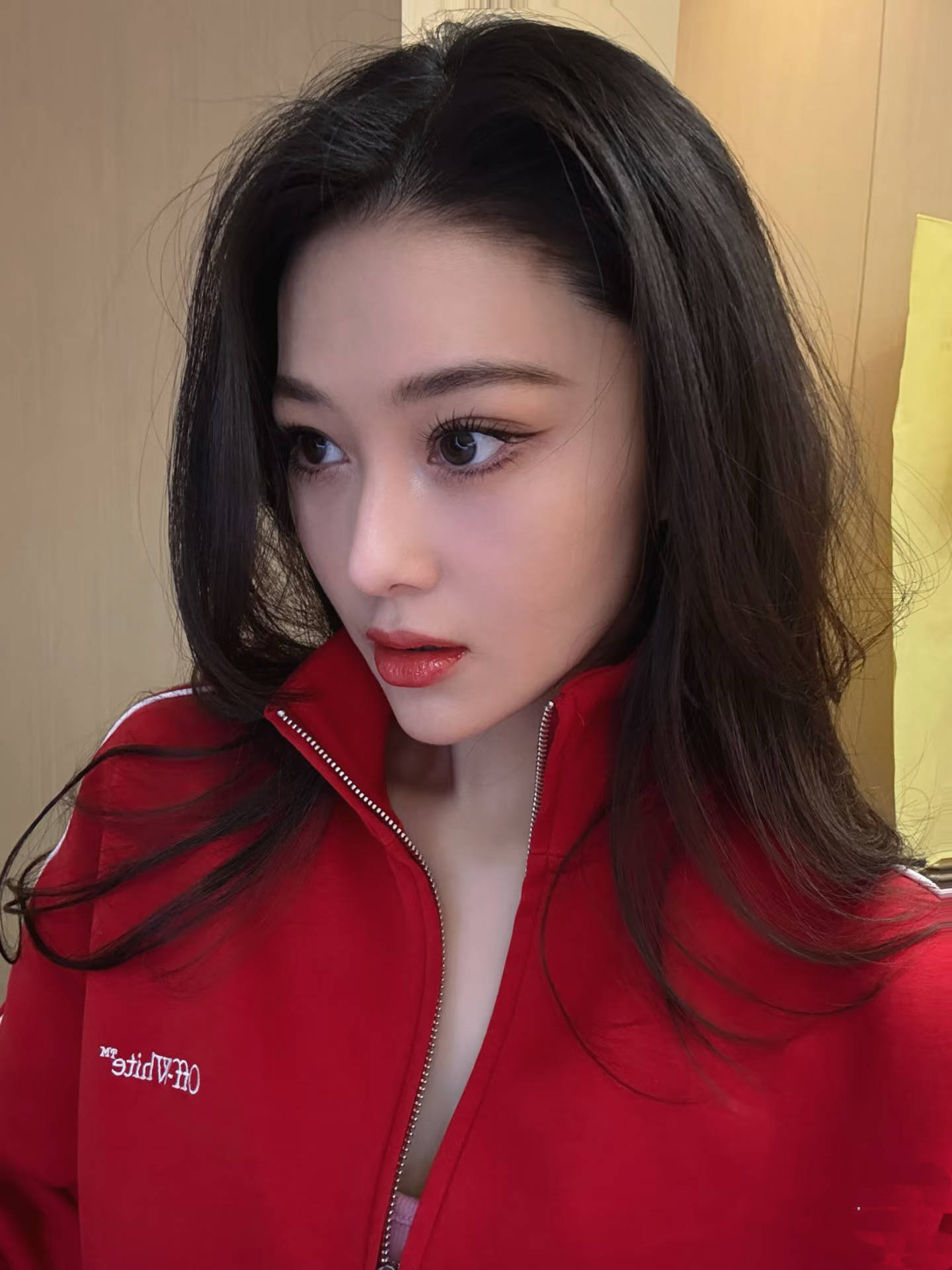 红色的运动套装,上身是短款卫衣、下身是高腰阔腿裤,一头飘逸的卷发、戴着墨镜,又美又飒,阳光明媚。