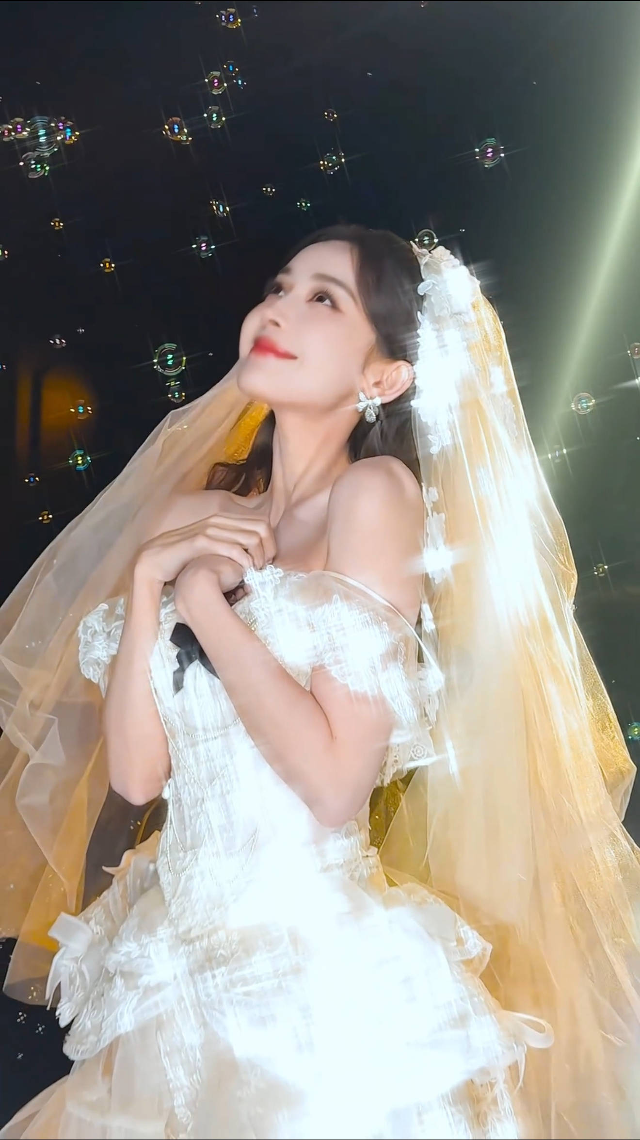 娜扎仰头浅笑,双手紧握。