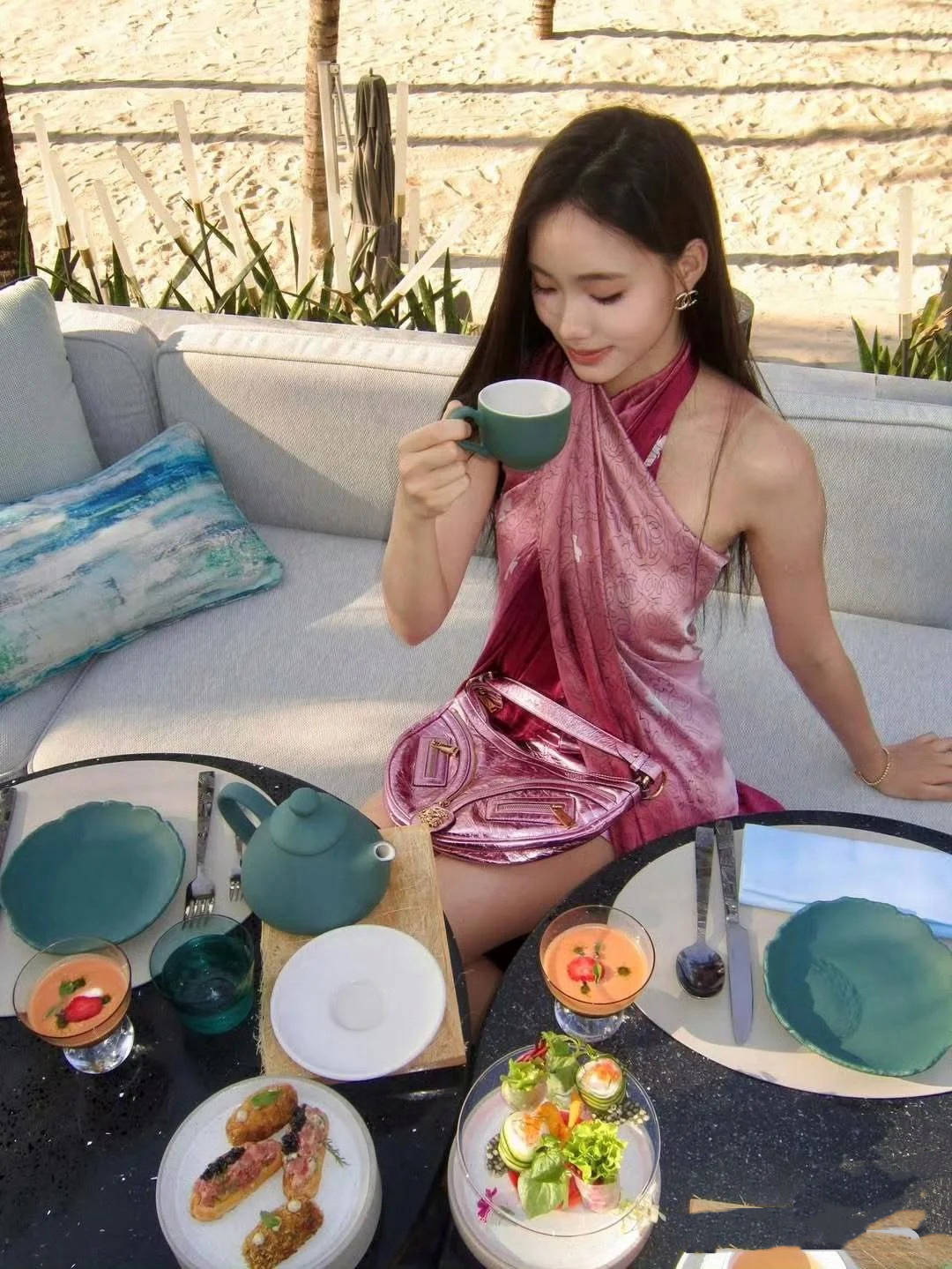 Lily的衣着风格也很多变,他穿着玫粉色的脖挂裙,热辣中带一点甜美。身材很妖娆、面容很甜美。