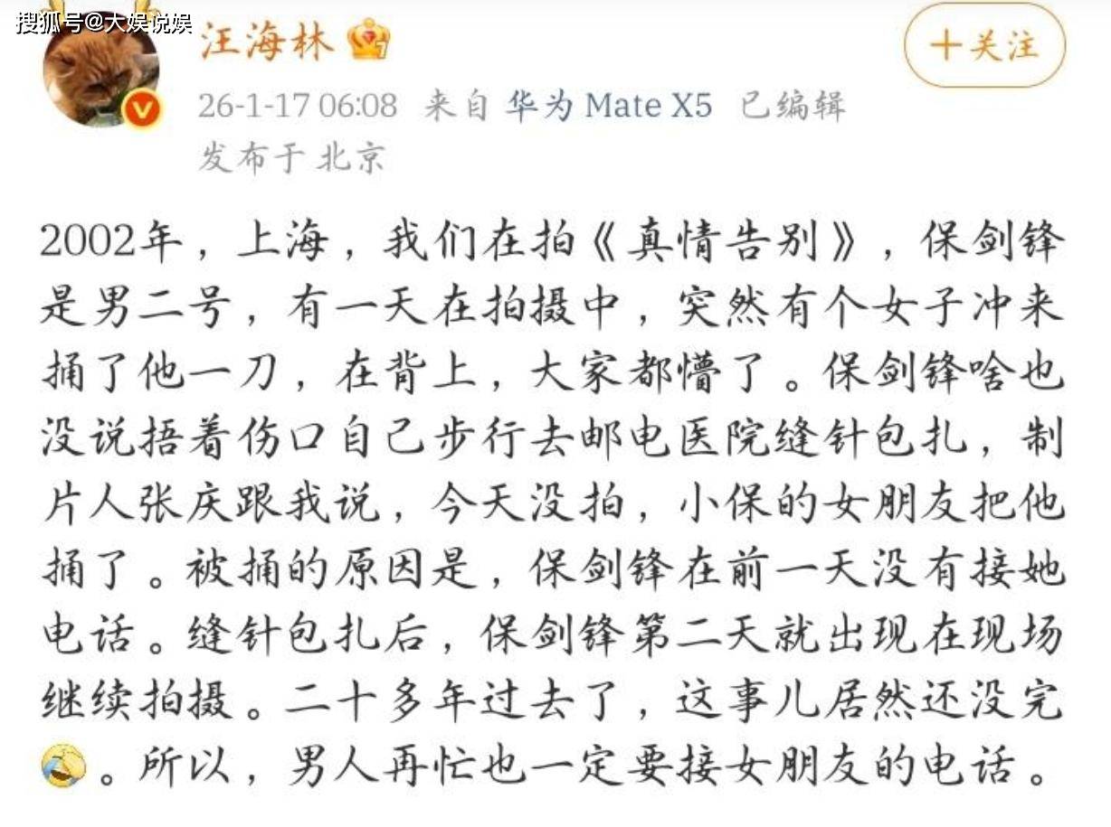 先是编剧汪海林,搬出了20多年前的一件往事,保剑锋在片场被人捅了,捅人的不是别人,而是他的前女友,原因是保剑锋前一天没有接电话。