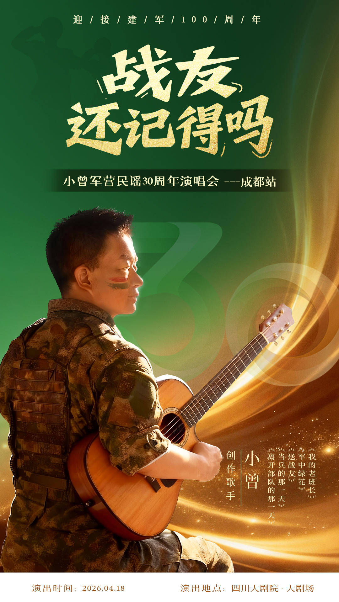 据了解,小曾不仅会在这场演唱会上唱响所有经典代表作,更将带来他近年来全新创作的军旅歌曲,每一段旋律都蕴藏着浓浓的情怀,每一句歌词都承载着对军营、对战友的深厚情谊。