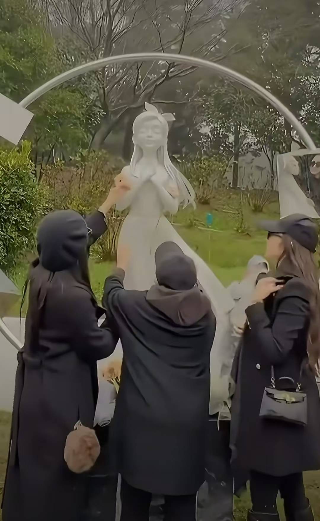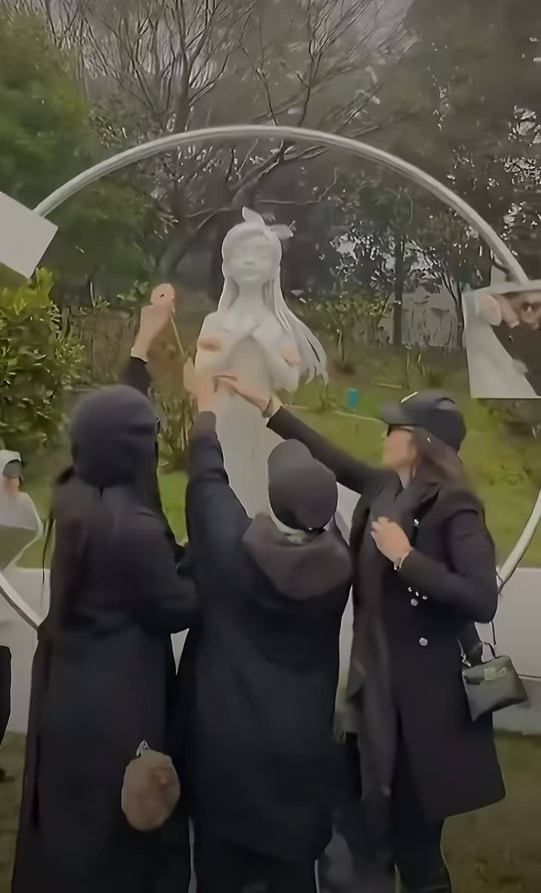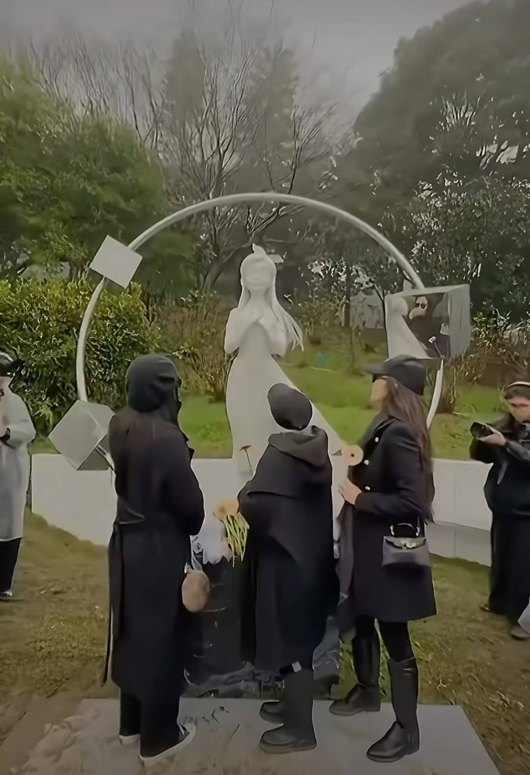 吴佩慈、范晓萱、范玮琪在雕像前献花,氛围伤感。