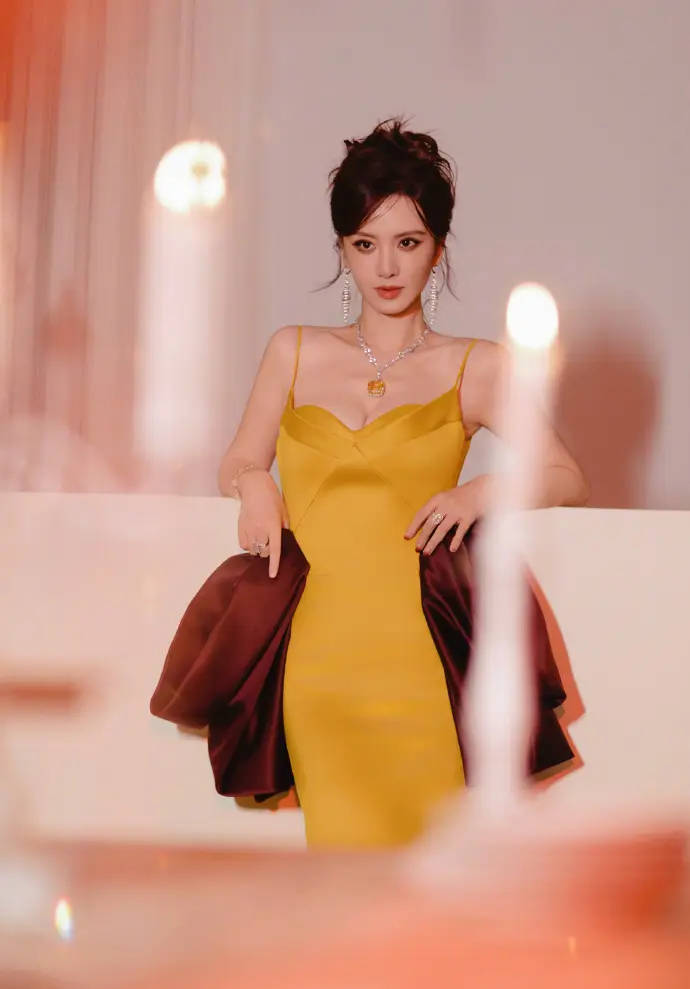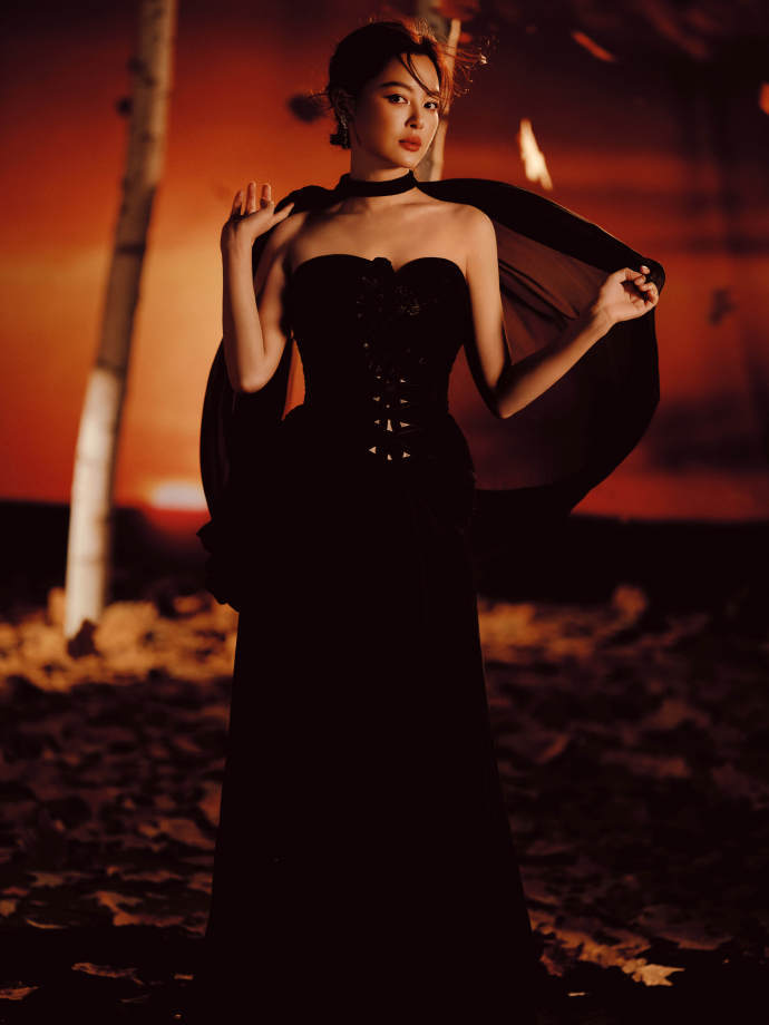 辛芷蕾穿黑色长裙,秀纤细肩颈线。