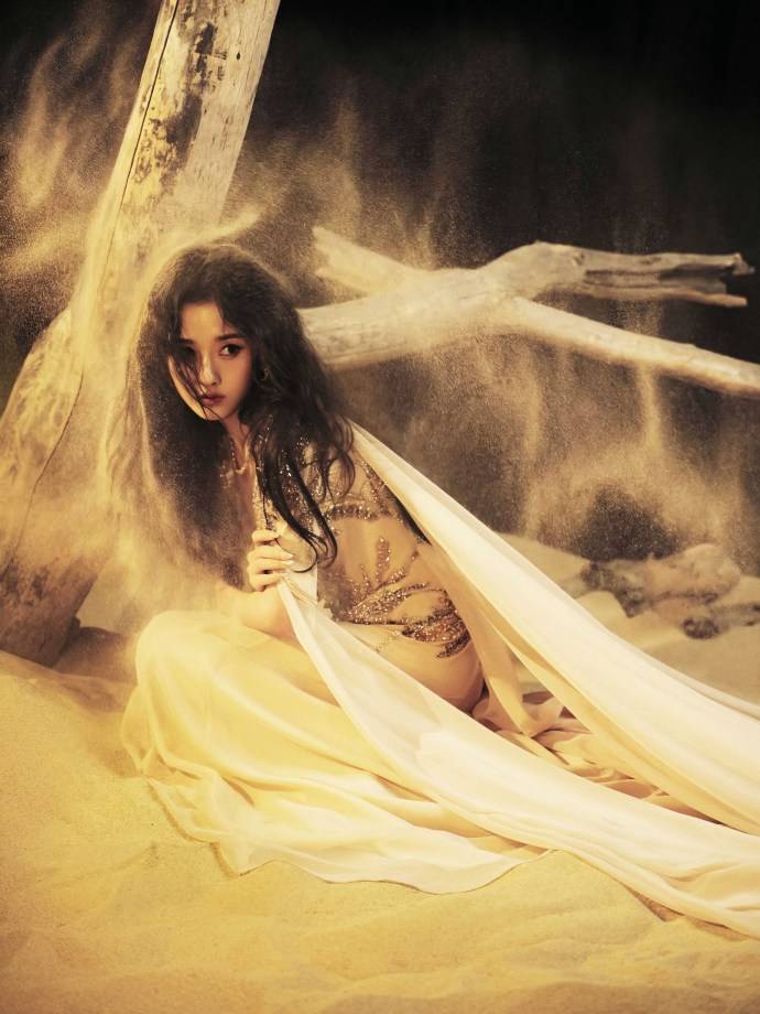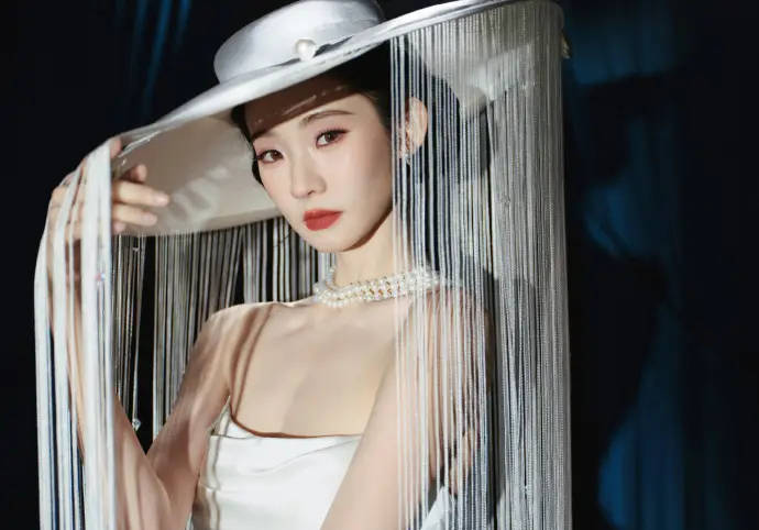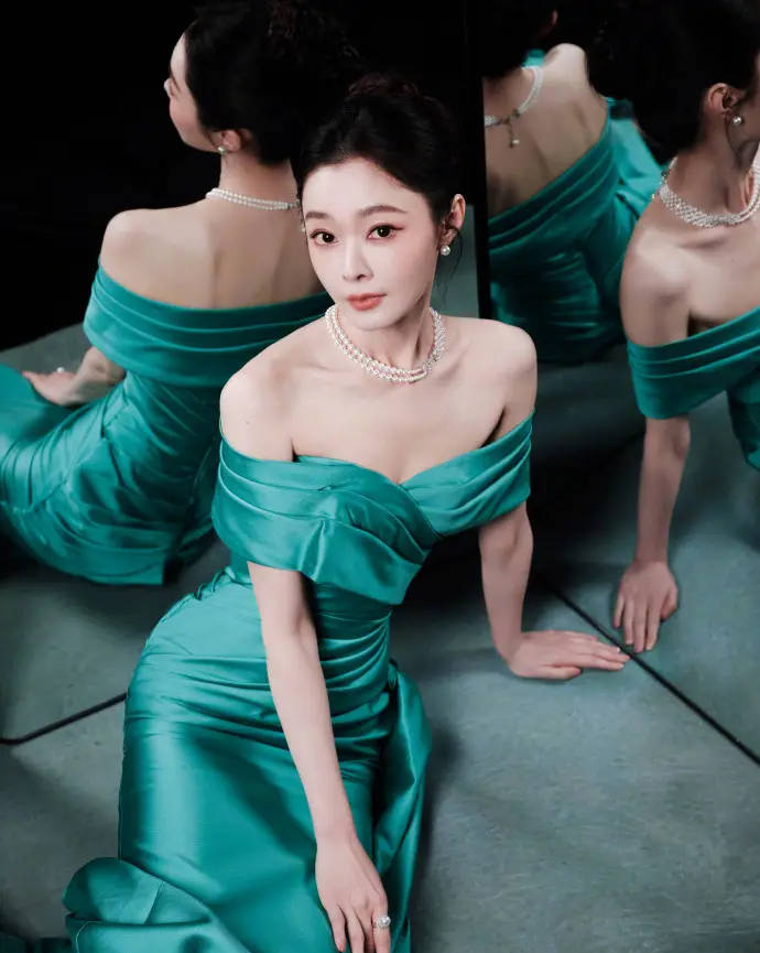 宋轶穿湖绿色抹胸裙,皮肤白皙。