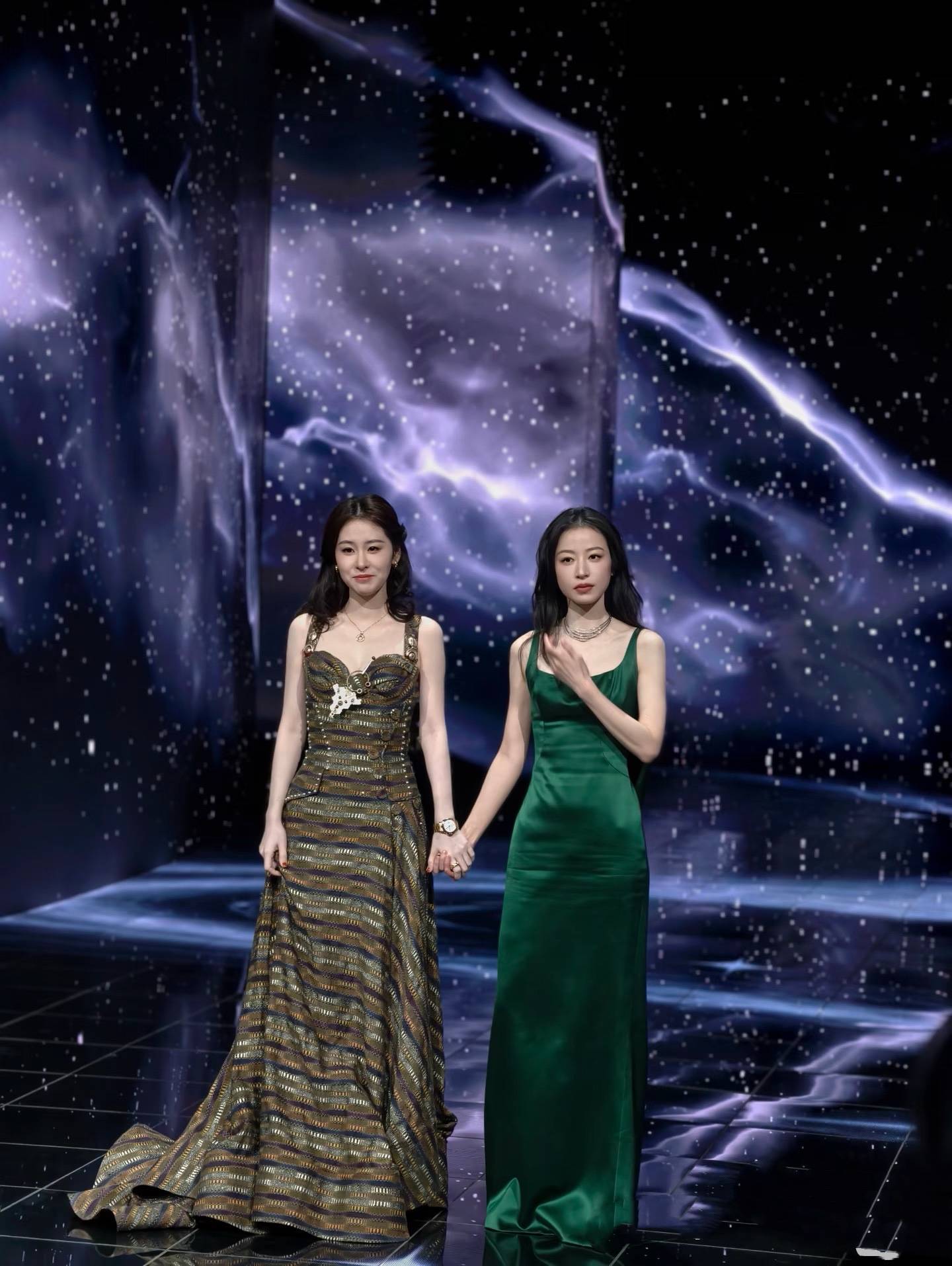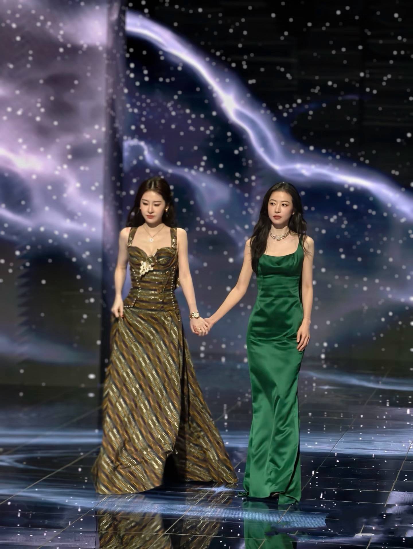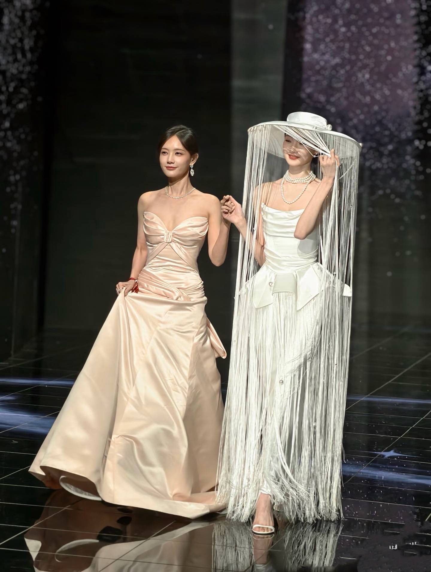李一桐和张艺凡牵手上台的时候,真是惊艳到我了。如果说李一桐造型简单,那么张艺凡这流苏斗笠简直就是华美。