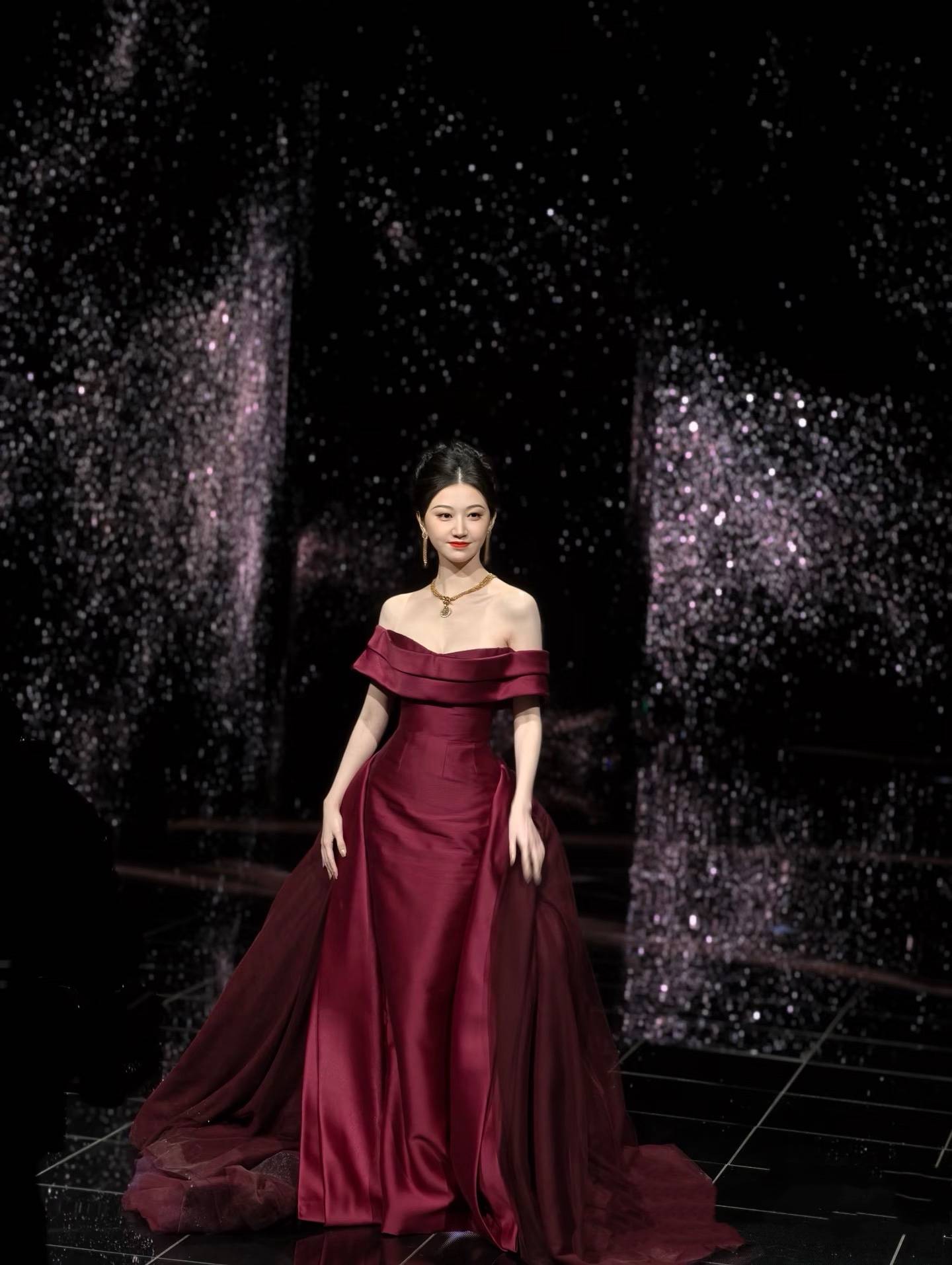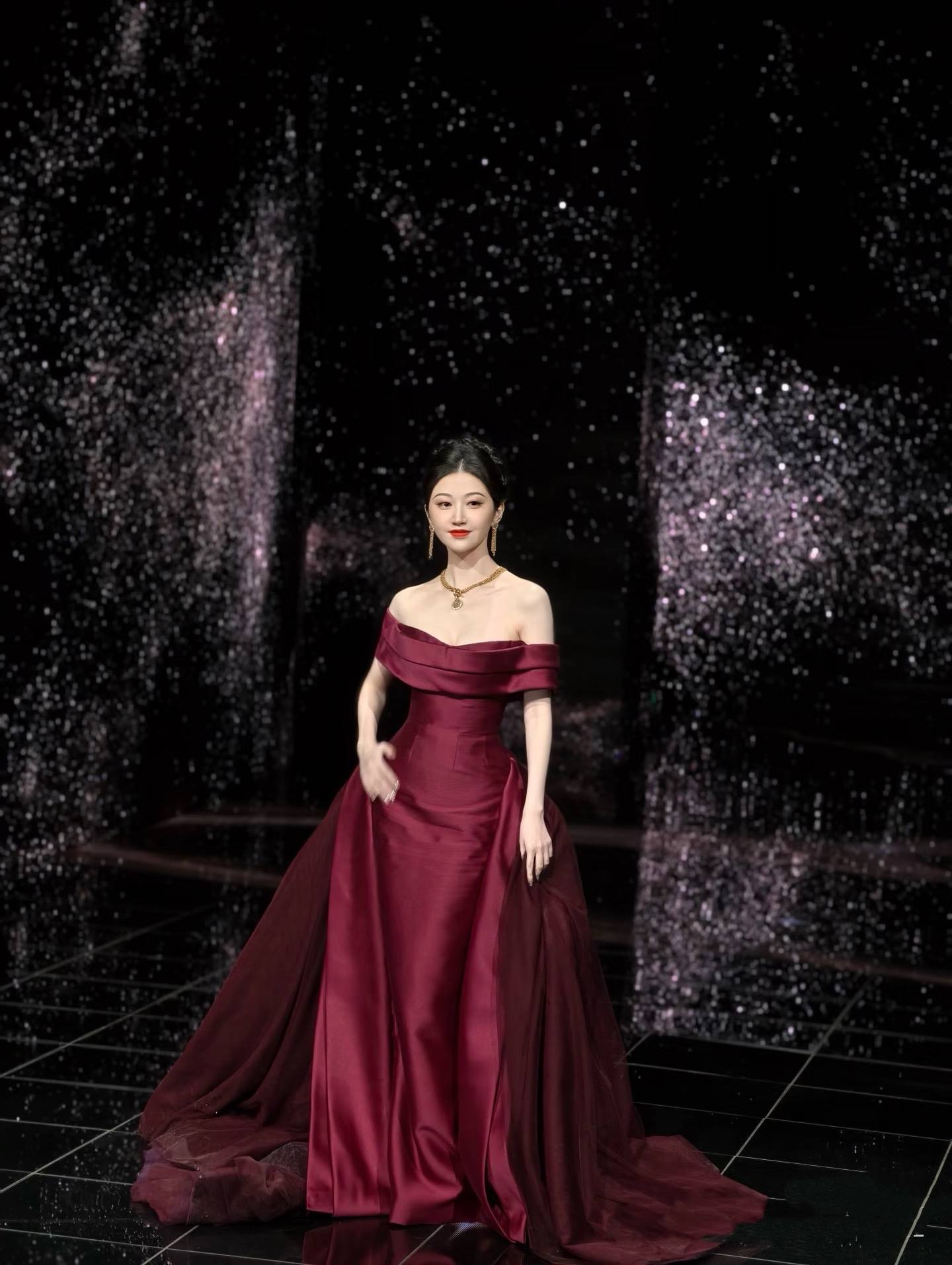 景甜穿着酒红色一字肩长裙,皮肤白皙、面容姣好,让人感叹大花就是大花,这浑身上下都散发着富贵范!