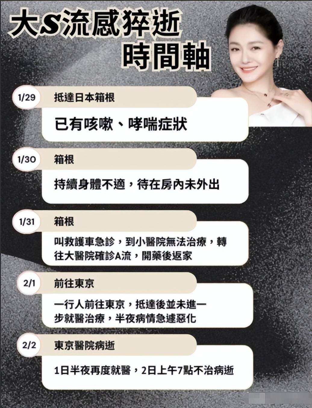 大S本就患有先天性二尖瓣脱垂及妊娠并发症导致的免疫系统脆弱,2025年1月29日,S家抵达日本旅行时,大S已出现咳嗽、哮喘等不适症状。