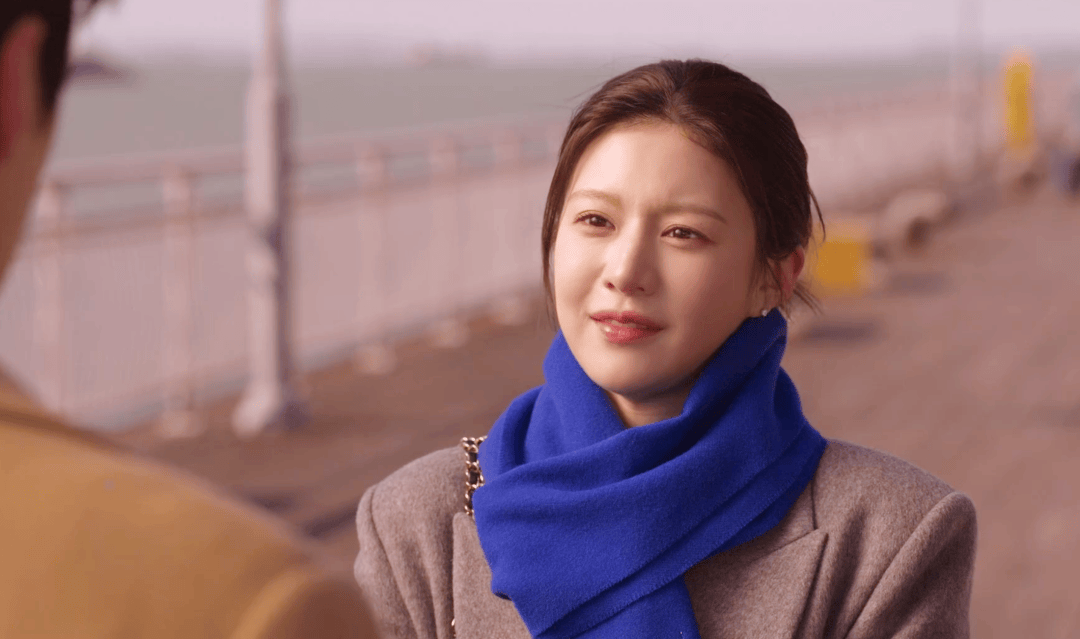 剧中她也有穿颜色较深的大衣, 在穿这类大衣时,她通常会用配饰去提亮脸部。