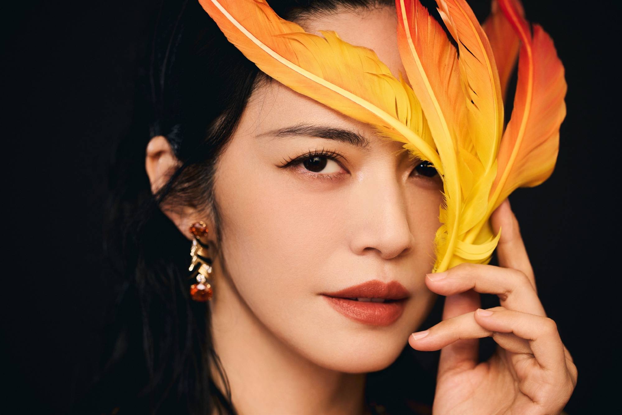 姚晨戴火焰羽饰,黑红背景氛围感拉满。