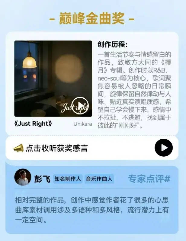 这一创新的创作方式,不仅为专业音乐人提供了便利,也让非专业背景的创作者有了被看见的机会。就比如,“漫游会议室”本是不懂乐理、不会乐器的理工科背景,但凭借对AI工具的熟练掌握,成功用“3A模式”(AI作词、作曲、编曲)实现了自己的音乐梦,作品屡成爆款,甚至成为此次大赛的评委。而巅峰金曲奖得主Unikara原本也是“平凡的热心听众”,《Just Right》甚至只是他的第二首作品。