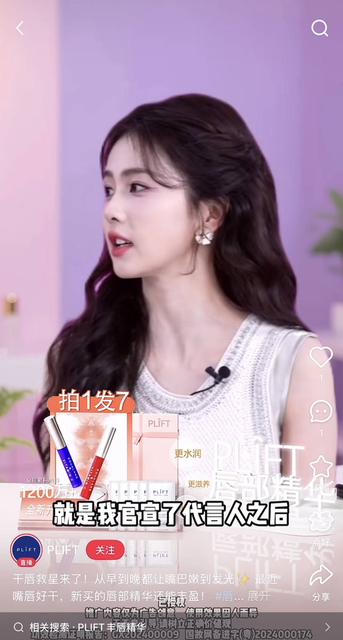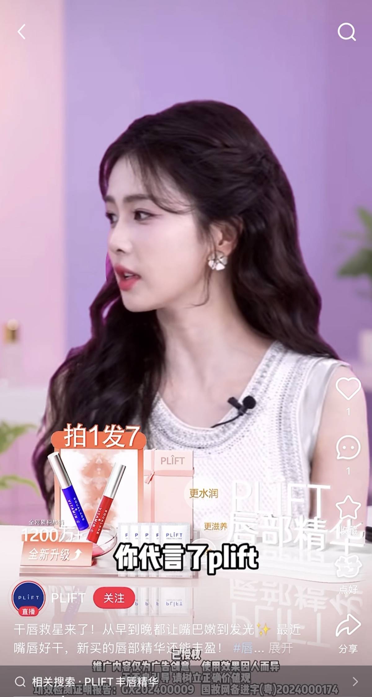 是否为赵露思真实推荐?极目新闻记者进一步搜索发现,上述视频实际截取自赵露思近日在四川的一场公益助农直播片段,且原直播中并未出现她推荐并使用PLIFT唇部精华的画面。