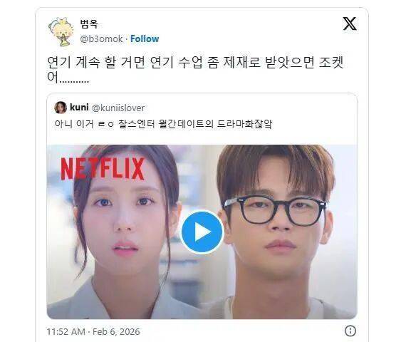 这波批评浪潮甚至引发了“比烂”联想。Jisoo的演技被不少人拿来与曾因“面无表情”表演而备受争议的偶像演员车银优作比较,无形中坐实了外界对“偶像转型演员演技堪忧”的刻板印象。