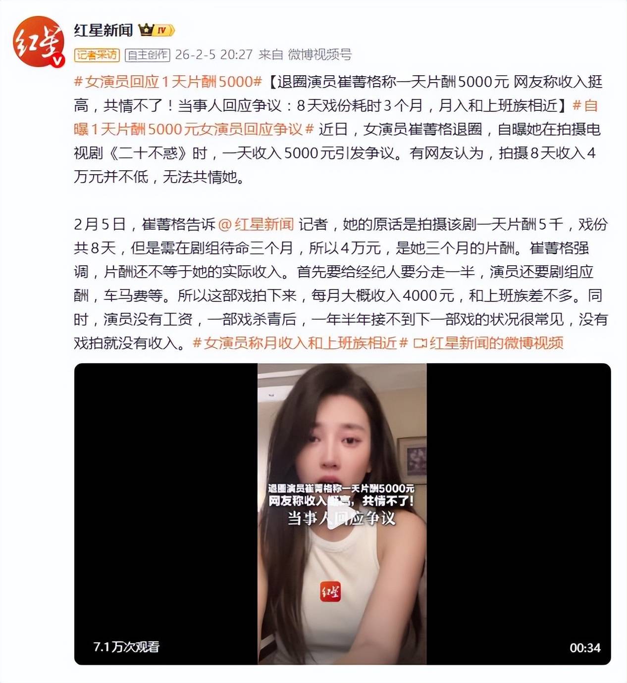 面对“日薪五千仍属高收入”的汹涌质疑,崔菁格在2月8日的回应视频中,给出了更现实的行业算法。她强调,演员的片酬并非单纯“日结工资”,它需要覆盖漫长的“空窗期”成本——试妆、培训、等待、自我提升,以及没有工作时的全部生活开销。一句“别用10年前的滤镜看现在的娱乐圈”,直接点破了公众认知与行业现状之间的巨大鸿沟。
