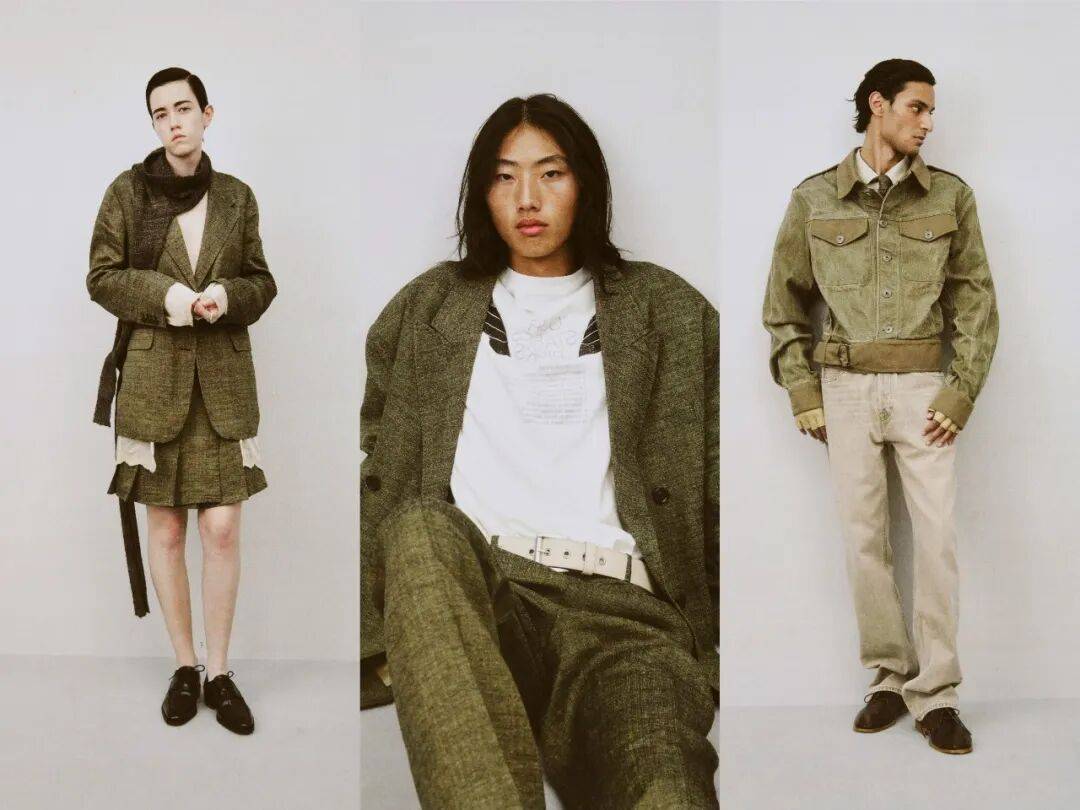 性别无界的穿搭思路贯穿全场,成为系列最具借鉴性的亮点。男式制服夹克通过腰部塑形处理,可直接适配女性身形,内搭蕾丝吊带或缎面背心,中和硬朗感;女装中的小开衩设计被嫁接到男装长裤中,搭配简约白T与复古运动鞋,增添利落细节。蕾丝元素的跨界运用堪称点睛之笔——蕾丝装饰的军装外套可搭配中性风衬衫与直筒裤,柔化工装的粗犷;女性穿着时则可内搭同色系蕾丝连衣裙,打造层次丰富的柔美造型。