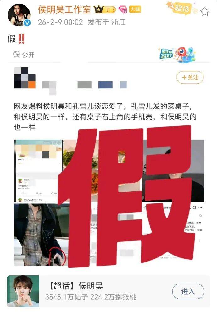 侯明昊工作室于2月9日00:02发文“假‼️”,强调“无交集”;孔雪儿工作室于00:23跟进声明“假!!!!”,斥责“纯属造谣”。双方回应间隔仅21分钟,被赞“高效止损”。