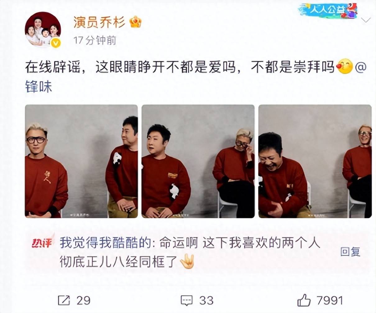 热搜上“乔杉看谢霆锋的眼神”引发的微妙解读,被当事人一场幽默的公开“表白”轻松化解。2月9日电影宣传现场,喜剧演员乔杉主动提及此前微博之夜的“眼神争议”,以高情商的自嘲澄清那纯属拍摄视角导致的误会,并对着台下的谢霆锋高声示爱:“从小看你电影长大,对你全是爱,全是崇拜!”他甚至还调侃要“下次见你我做个双眼皮,显得眼睛大”以证清白,引得全场大笑。谢霆锋则笑着挥手回应,并以拱手动作友好互动,两人随后晒出的欢乐合照,彻底击碎了此前的不和传闻。