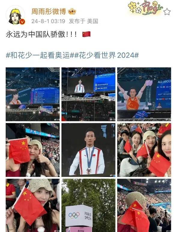 起因是周雨彤在网上晒出一张自拍,自拍中的她坐在奥运观赛席,笑得一脸开心,手上还拿有一面五星红旗。