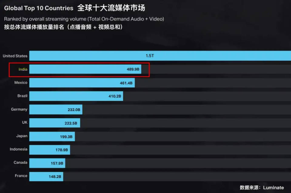 印度则是正在迎接爆发的新兴市场:Spotify发布的数据显示,印度音乐人的作品在国际市场上的播放量从2019到2023年增长超过2000%;数据服务商Luminate发布的《2025音乐报告》则显示,印度目前已是全球第二大流媒体市场。
