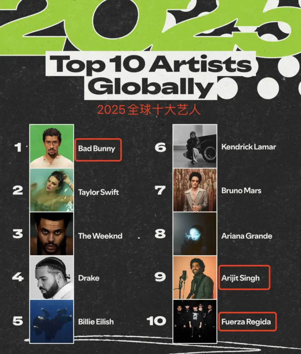 2025年,全球音乐市场的去英语中心化趋势表现得格外突出,三组非英语系艺人进入Spotify年度艺人前十:坏痞兔名列第一,印度歌手阿里吉特·辛格(Arijit Singh)和西语乐队Fuerza Regida首次上榜。