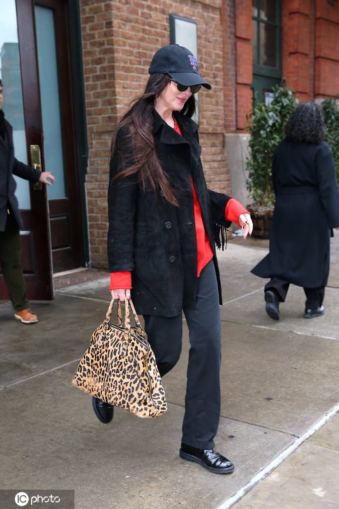 达科塔·约翰逊身穿豌豆大衣与黑色长裤,手持普拉达豹纹手包,无名指佩戴戒指。