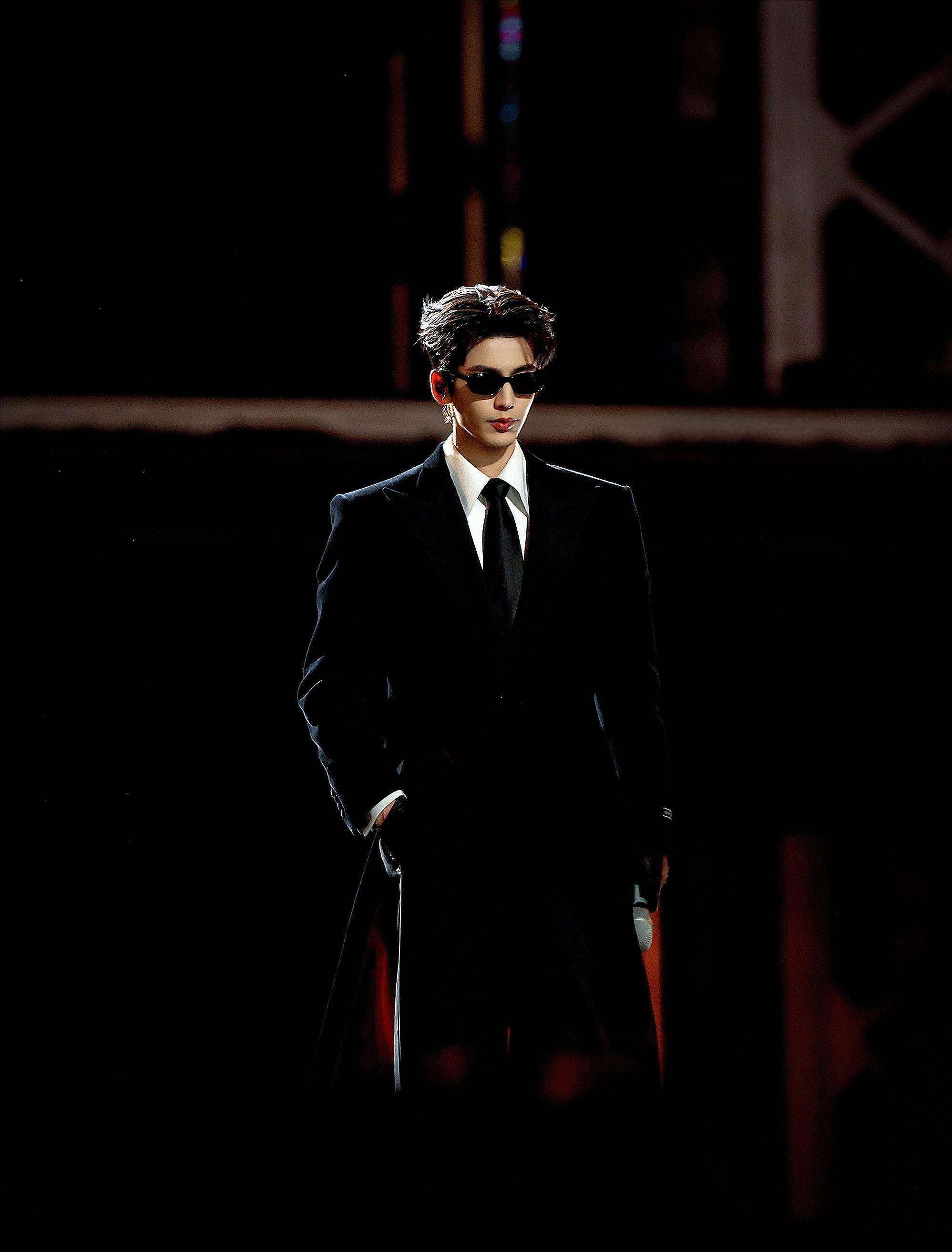 这短短40秒的舞台表演,堪称内娱男色经济3.0时代的经典范本。与1.0时代的直白肉体展示、2.0时代的情感剧场化不同,张凌赫以一副墨镜在台上完成了极致的氛围打造:那反光镜片让他眼神若隐若现,既拒绝了完全暴露的视线,又让观众迫不及待地去揣摩他眼镜下隐藏的情绪。而那根权杖作为配饰,完美中和了西装的严肃感,巧妙地混搭出一股雅痞的气质。强光下,他那冷白的皮肤与黑色服装形成了强烈的视觉冲击感,粉丝们更是调侃他像一个人形光污染源,仿佛就在焊接钢筋。这种半遮半掩的神秘感,正巧引发了心理学中的蔡格尼克效应——越是看不清楚的部分,越会让人反复琢磨,忍不住回味。