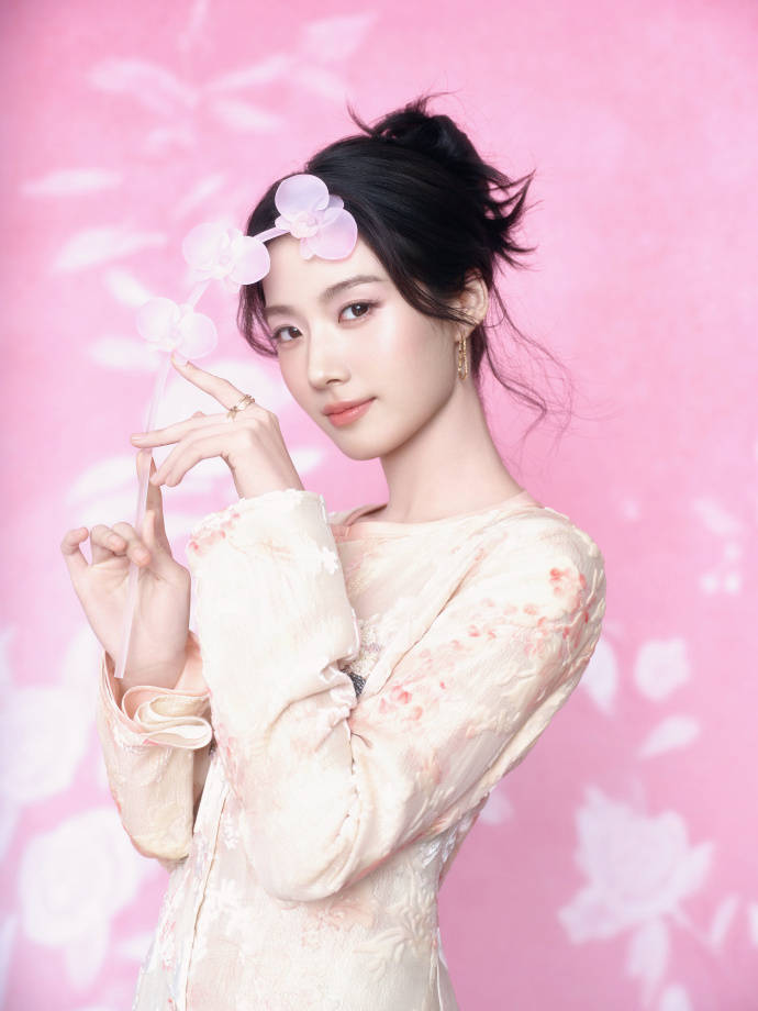 卢昱晓穿嫩粉色套装。