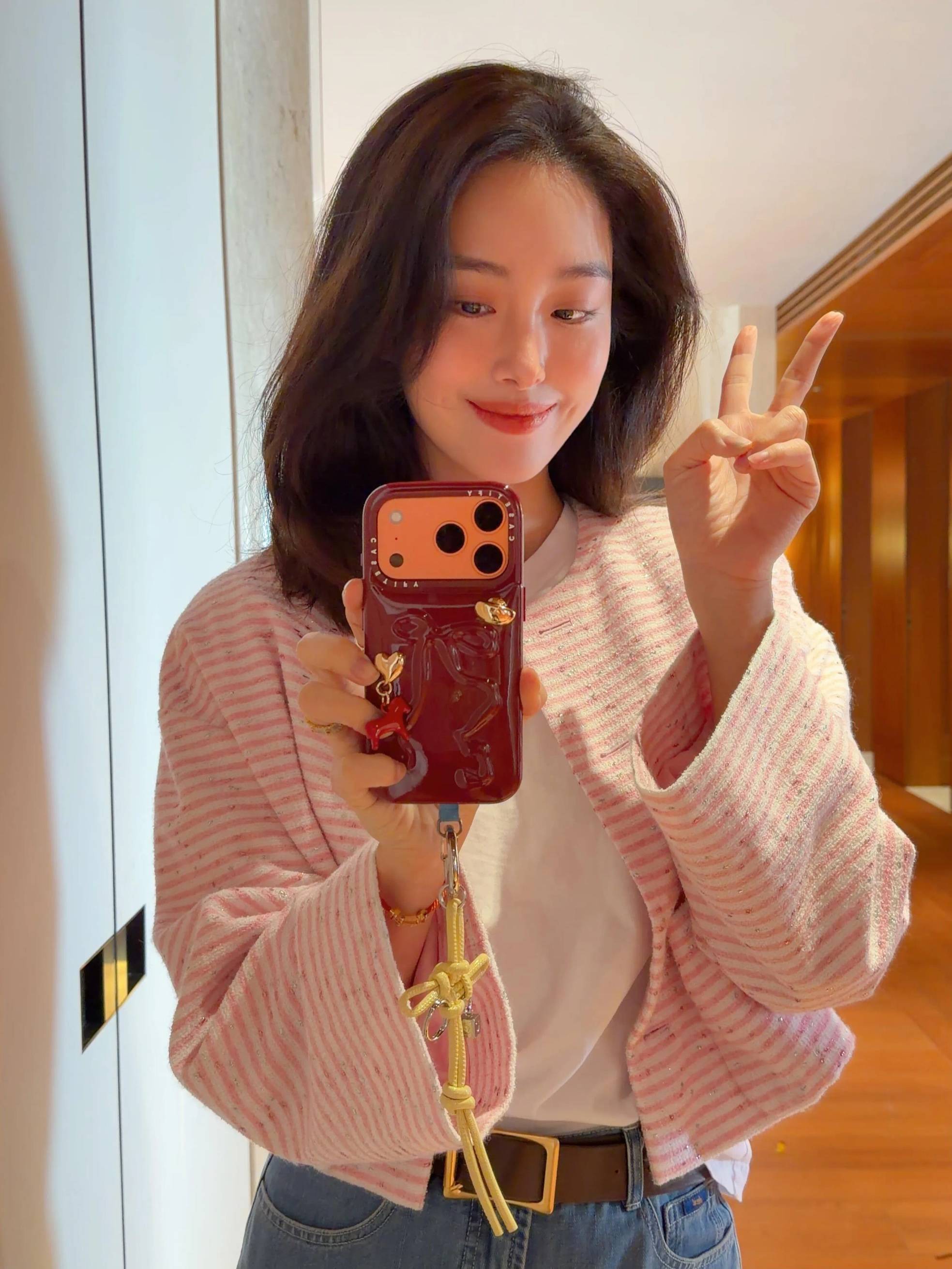 她手里拿着最新款的水果手机,也是很潮流的爱马仕橘。微卷分长发,营造出一种法式风情的优雅,搭配酒红色手机壳很好看。