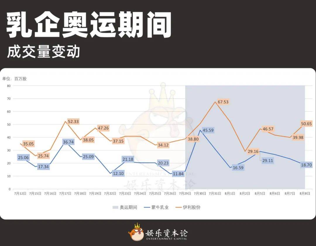 问题主要出在前期。7月29日-7月30日,股票成交量走高的背后,蒙牛和伊利都出现了连续的股价下滑,蒙牛在7月30日更是跌去6.5%。这意味着,奥运会开幕后,市场情绪并不乐观,而是正在交易对乳企赞助效果的悲观预期。