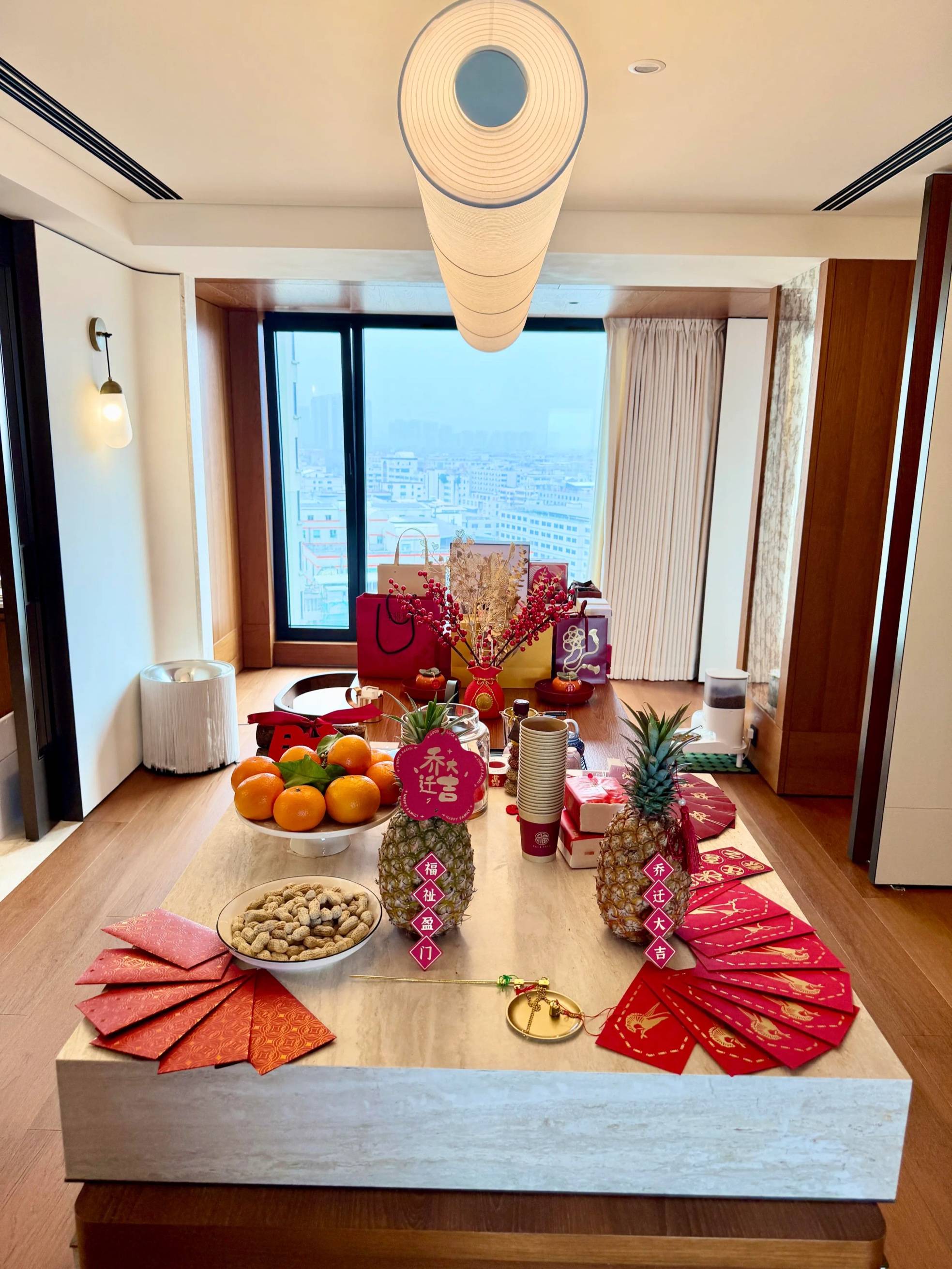房间里的每一个角落,都特别有设计感。在桌面上摆满了红包、凤梨、花生,这些带着美好寓意的东西。