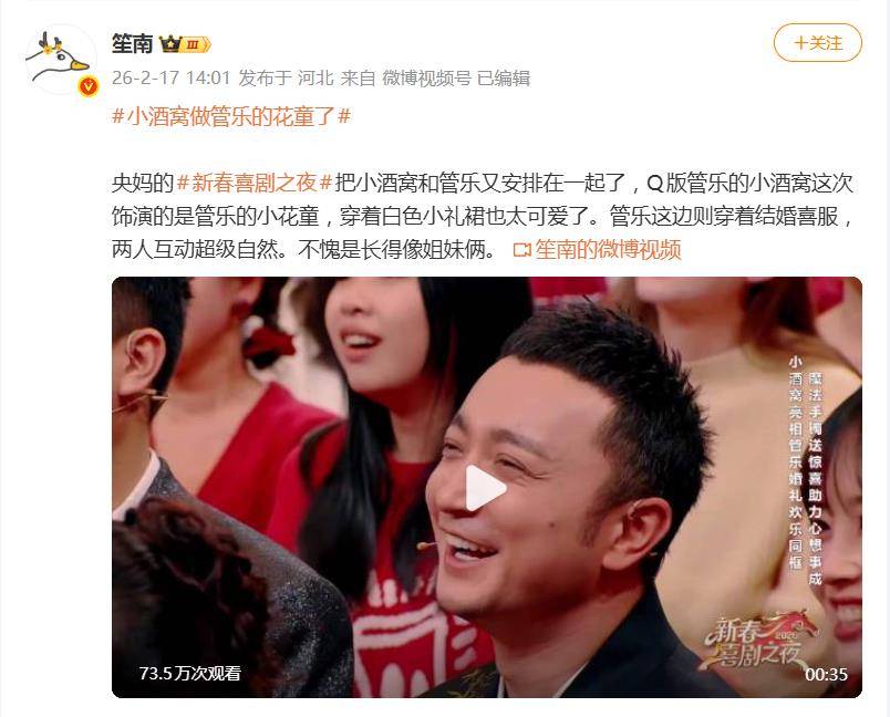 这可不是观众第一次“嗑”这对奇妙的组合。早在2025年,管乐的母亲就亲自下场认证,称小酒窝是“Q版管乐”。这次在春晚的舞台上同台共舞、同步表演,简直是把这份“官方认证”的相似度焊死在了观众心里。网友纷纷调侃:“这哪是选角,这是直接找到了‘幼年版’自己!”“亲姐妹都没这么像,央妈也太会安排了!”