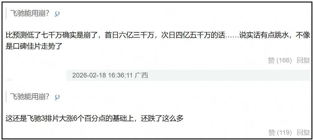 还有《飞驰人生3》,看似是2026年春节档电影唯一票房遮羞布,结果也没稳住,如果晚场票房涨不上去,到时候日票房破不了五亿,那就是跳水的走势了……