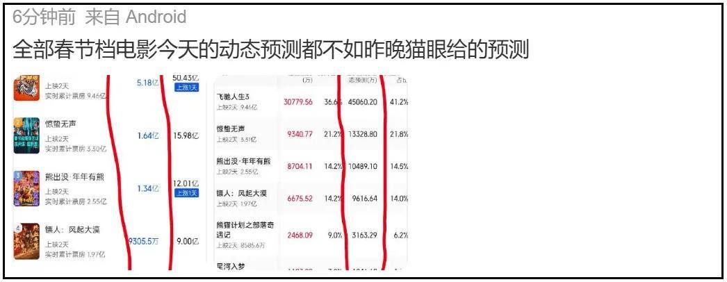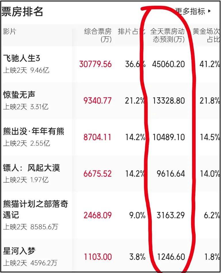 提前预测不难懂。简单说,就是售票平台会在大年初一预测大年初二票房,通过模型测算,平台认为《飞驰人生3》、《惊蛰无声》、《熊出没·年年有熊》大年初二日票房都能破亿,《飞驰人生3》可以拿下5.18亿。